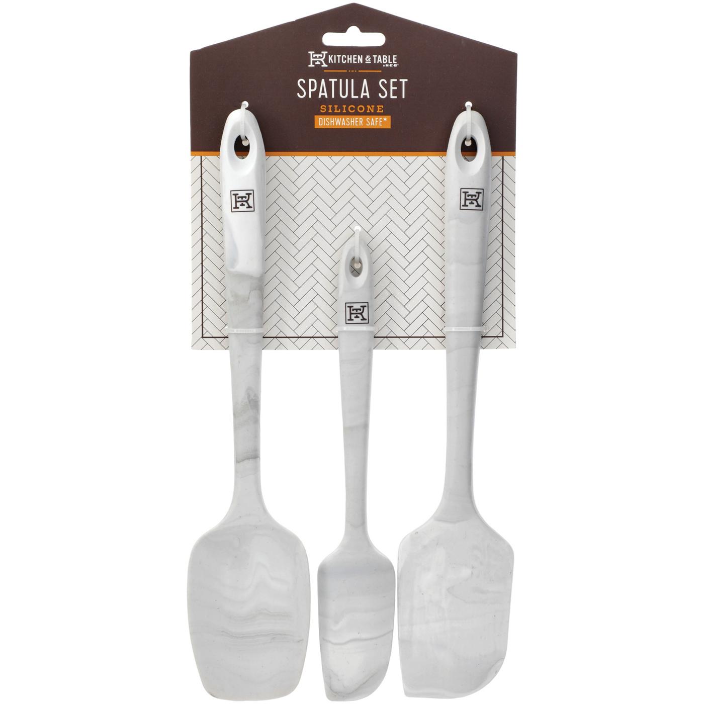 The Kitchen & Table by H-E-B™ 3-Piece Silicone Spatula set displays a trend forward white marble design and is made with BPA free silicone. Heat resistant to 450 F (232 C), the set is perfect for everyday use in the kitchen. They are also dishwasher safe, top rack only for an easy clean-up. Perfect to have in any kitchen!