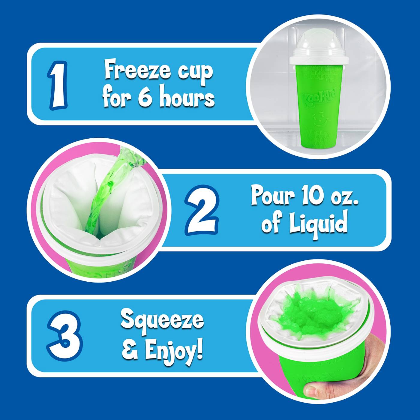 • EASY AS 1-2-3: Making a refreshingly sweet slush drink has never been easier with this fast-freezing cup. Simply freeze the ice pack, add your beverage of choice, and squeeze the up until your frozen drink is ready.