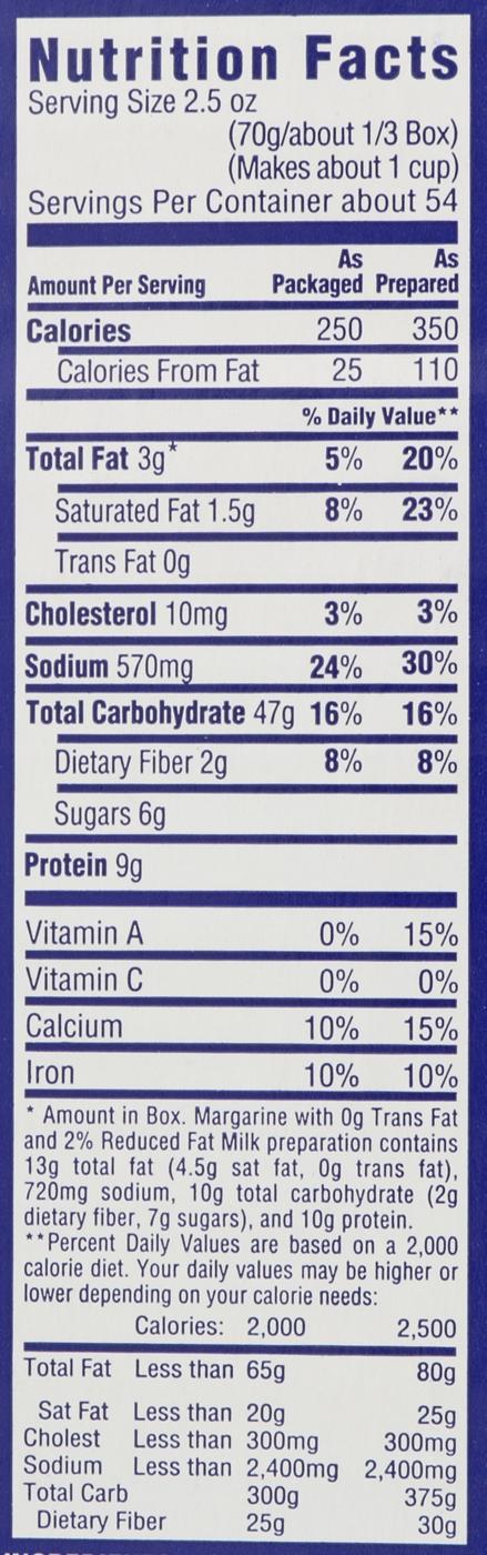 Enriched Macaroni (Wheat Flour, Durum Flour, Niacin, Ferrous Sulfate [Iron], Thiamin Mononitrate [Vitamin B1], Riboflavin [Vitamin B2], Folic Acid), Cheese Sauce Mix (Whey, Milkfat, Milk Protein Concentrate, Salt, Sodium Triphosphate, Contains Less than 2% of Citric Acid, Lactic Acid, Sodium Phosphate, Calcium Phosphate, with Paprika, Turmeric, and Annatto Added for Color, Enzymes, Cheese Culture).Allergens and safety warnings