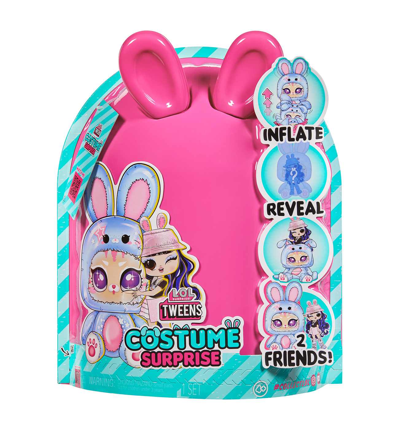 Get ready to unwrap the ultimate surprise and dive into an unboxing adventure like no other with the all-new L.O.L. Surprise Tweens Costume Surprise . This outrageously fun, experiential reveal is bursting with layers of surprises, perfect for endless imaginative and storytelling play for kids. Discover what’s inside by first tearing the zipper at the bottom of the packaging and lifting up the outer pink shell to reveal a mystery wrapping paper, kicking off the first stage of the inflating process! Watch as the paper grows bigger and fuller and once completely inflated, rip open the paper to discover your charming costume! But wait, the surprise doesn’t stop there! Undo the velcro from the back of thecostume's head to unveil your gorgeous Tweens doll hidden inside! Don’t forget to unbox the unique surprises and remove the Tweens doll from her doll stand to dress her in trendy new fashions and accessories! Close up the pet costume and watch as it grows and fully inflates, giving you two best friends to play with together! And the fun doesn’t stop there - simply toggle the on and off switch at the bottom of your pet costume to repeat the inflating fun over and over again!