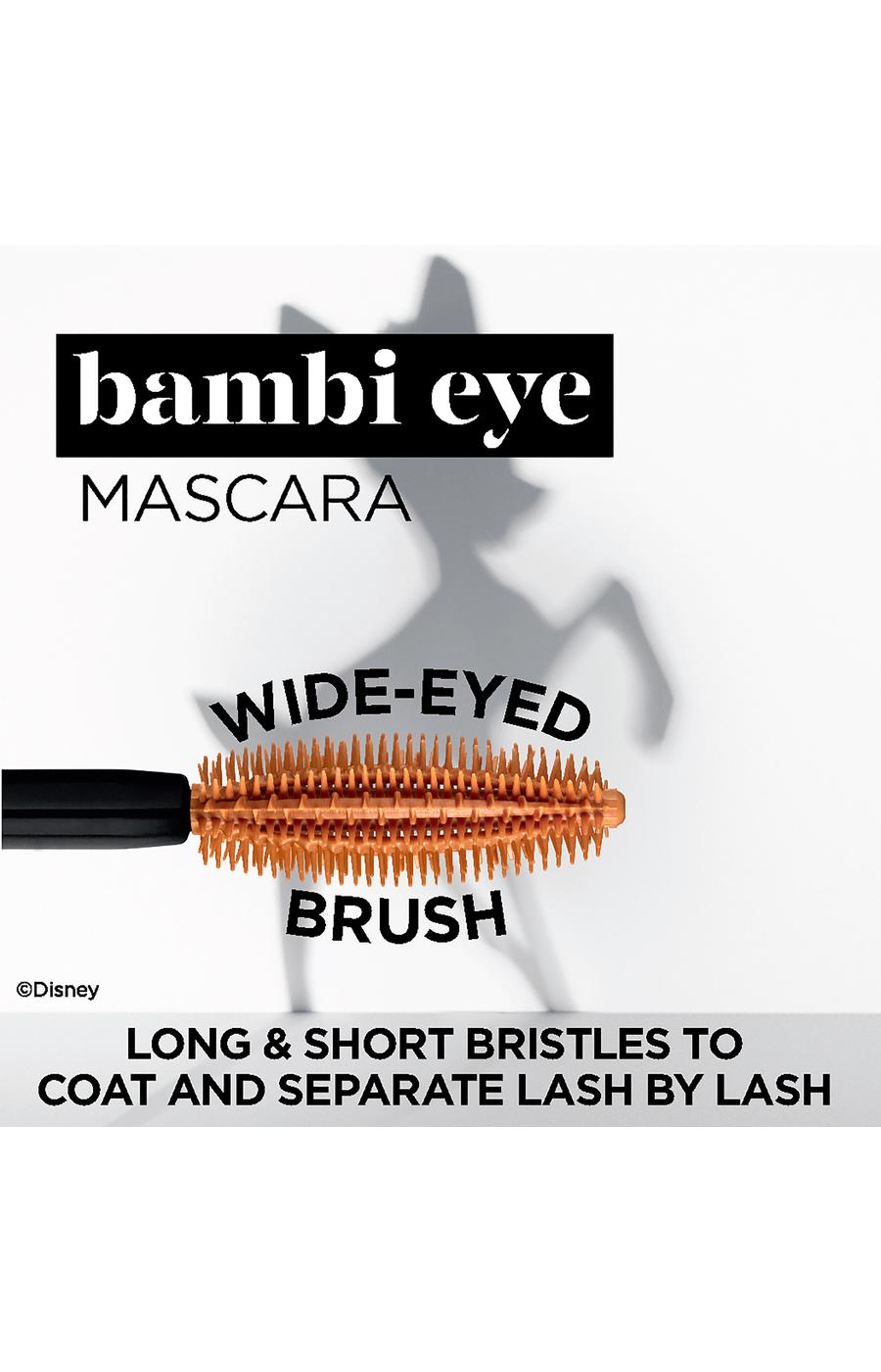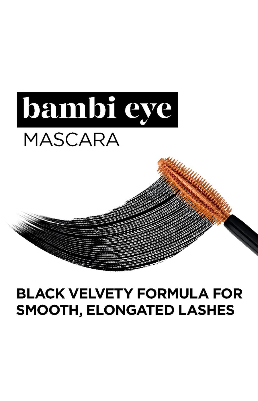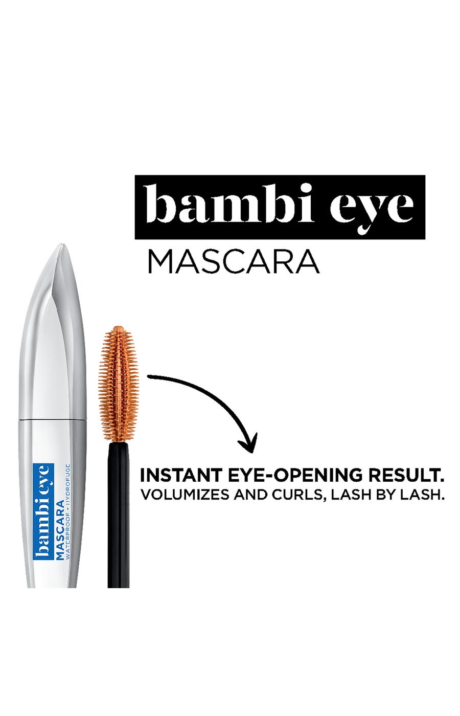 Instant eye opening waterproof mascara volumizes and Curls, lash by lash,2 out of 3 women saw bigger, wide open eyes,7 out of 10 agreed does not clump upon application,Wide-eyed brush with long and short bristles coats and separates lash by lash,Open your eyes to Bambi Eye Mascara and discover an instant eye-opening result that volumizes and curls each lash. Bambi Eye's black velvety waterproof formula glides on smoothly for lifted, elongated lashes, without clumps. The unique Wide-Eyed Brush features long and short bristles to separate and coat every lash. 2 out of 3* women saw bigger, wide-open eyes with Bambi. 7 out of 10* agreed it does not clump upon application. Lifted, curled lashes and plenty of definition for a wide, open-eyed effect are just a few swipes away with Bambi Eye Mascara.