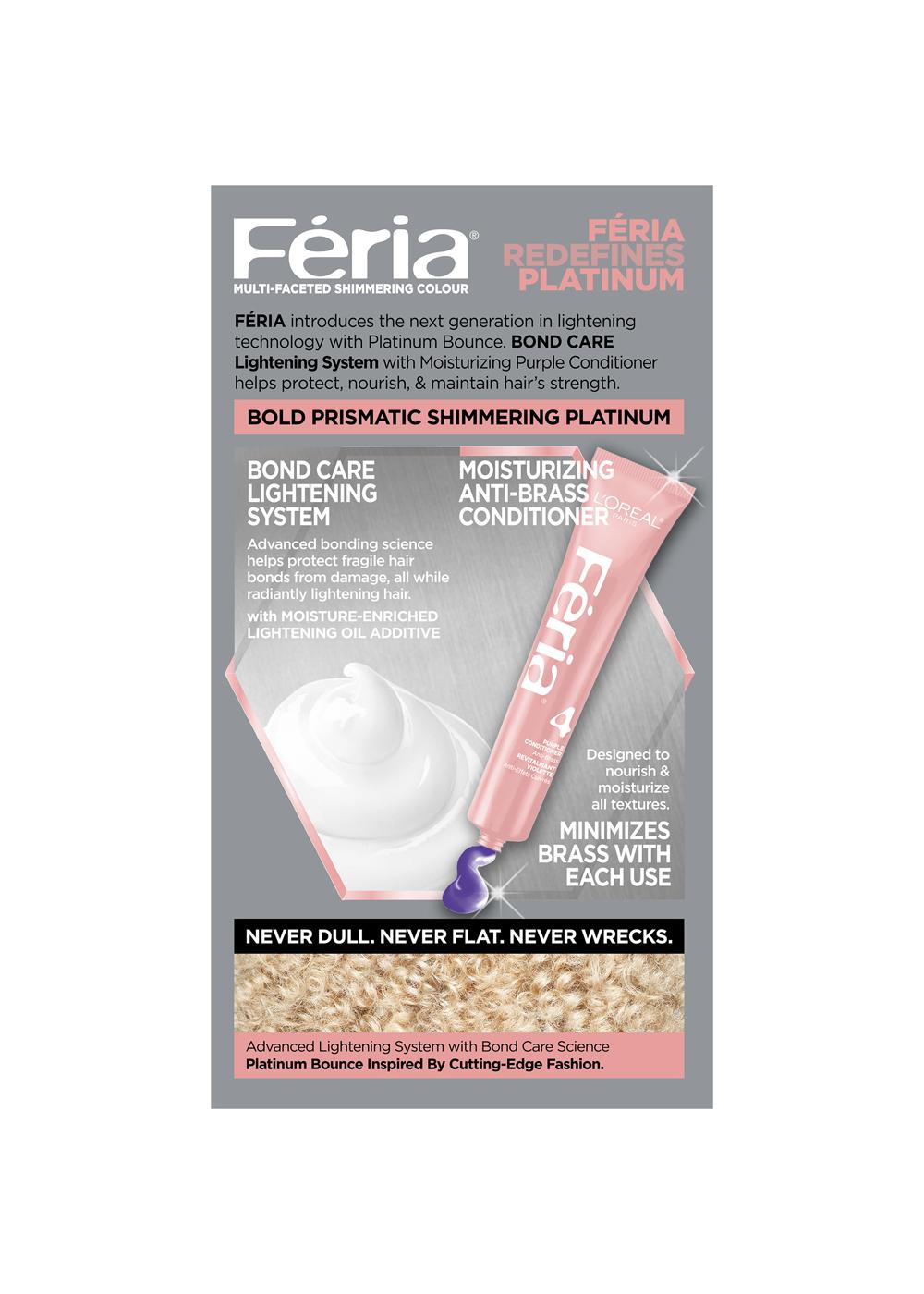 Achieve a luminous result with the L'Oréal Paris Féria Platinum Bounce Bond Care Lightening System. This kit is designed to lighten hair to a beautiful platinum blonde while caring for its structure. It is specially formulated to be suitable for naturally curly and coily hair.• Hair lightening system with integrated bond care• Lifts hair up to 7 levels for a dramatic platinum result• Formulated to protect hair bonds and strength during lightening• Anti-brass conditioner helps maintain a cool, platinum tone