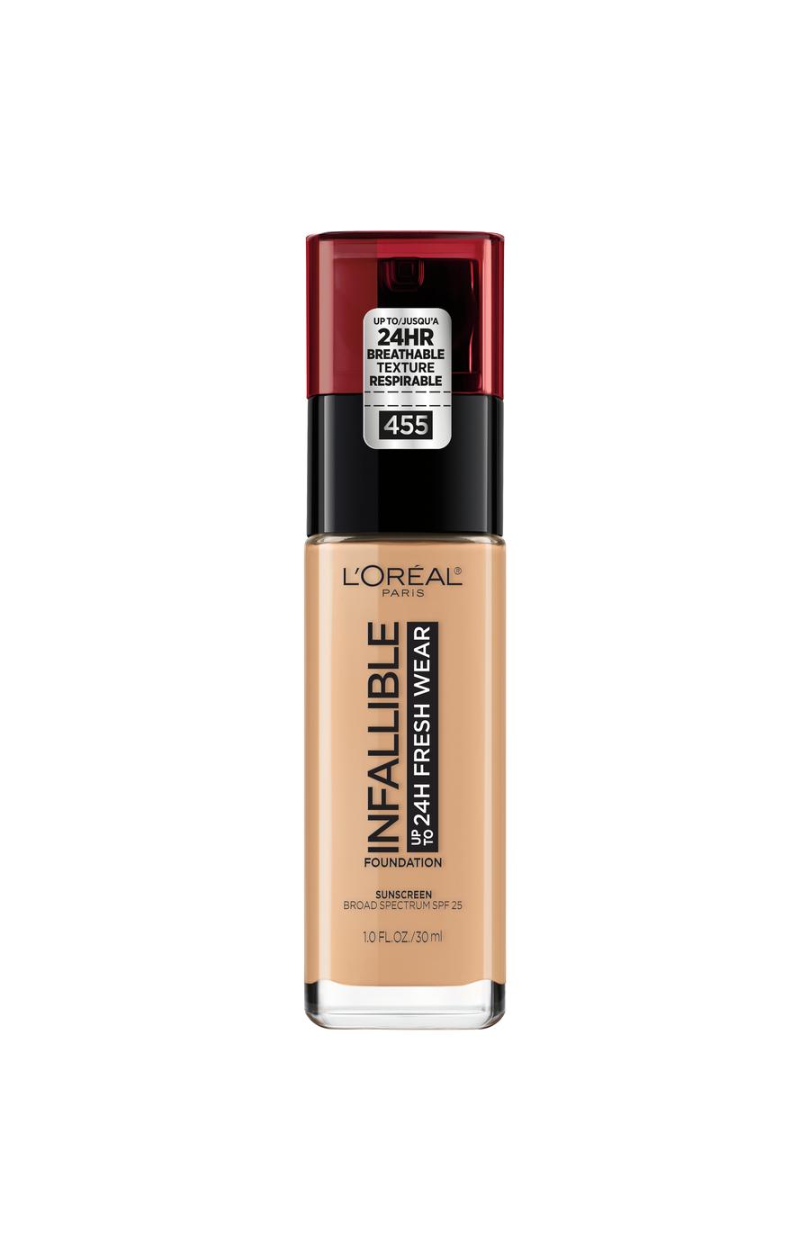 Achieve a beautiful and long-lasting look with L'Oréal Paris Infallible Fresh Wear Foundation in shade 455 Natural Buff. This liquid foundation provides reliable, long-wearing coverage with a lightweight formula that is comfortable for all-day use. The breathable texture blends seamlessly into the skin, helping to create an even and perfected complexion with a natural finish.• Up to 24-hour wear that resists transfer and sweat.• Formulated with Broad Spectrum SPF 25.• Offers medium, buildable coverage for a customized look.