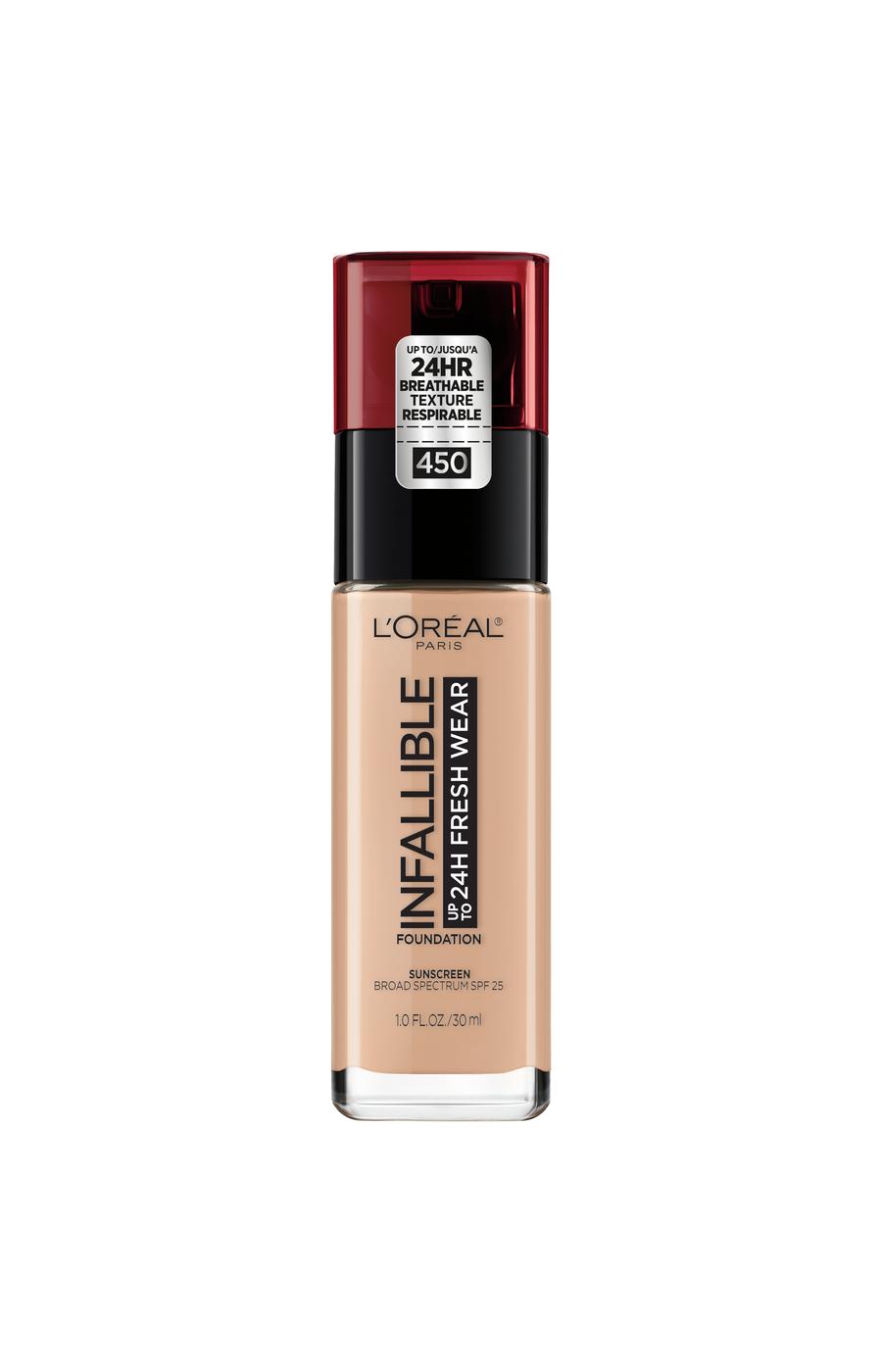 Enjoy a fresh and flawless look with the L'Oréal Paris Infallible Fresh Wear Foundation in shade 450 Rose Beige. This liquid foundation provides long-lasting, reliable coverage with a lightweight formula that is comfortable enough for all-day wear. The breathable texture blends seamlessly into the skin, helping to create an even and perfected complexion with a natural finish.• Up to 24-hour wear that resists transfer and sweat.• Formulated with Broad Spectrum SPF 25.• Offers medium, buildable coverage for a customized look.