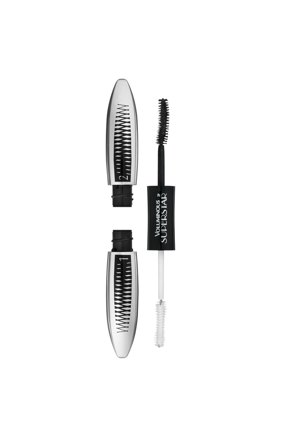 Create high-impact lashes with the L'Oréal Paris Voluminous Superstar Mascara in 'Blackest Black'. This dual-ended system combines a volumizing primer and a fiber-rich mascara to deliver dramatic length and fullness. The rich, deep color defines your eyes, while the washable formula ensures it all removes effortlessly at the end of the day.• Dual-sided primer and mascara for intense volume• Washable formula removes easily with soap and water• Creates a fiber-rich, lash-extending look
