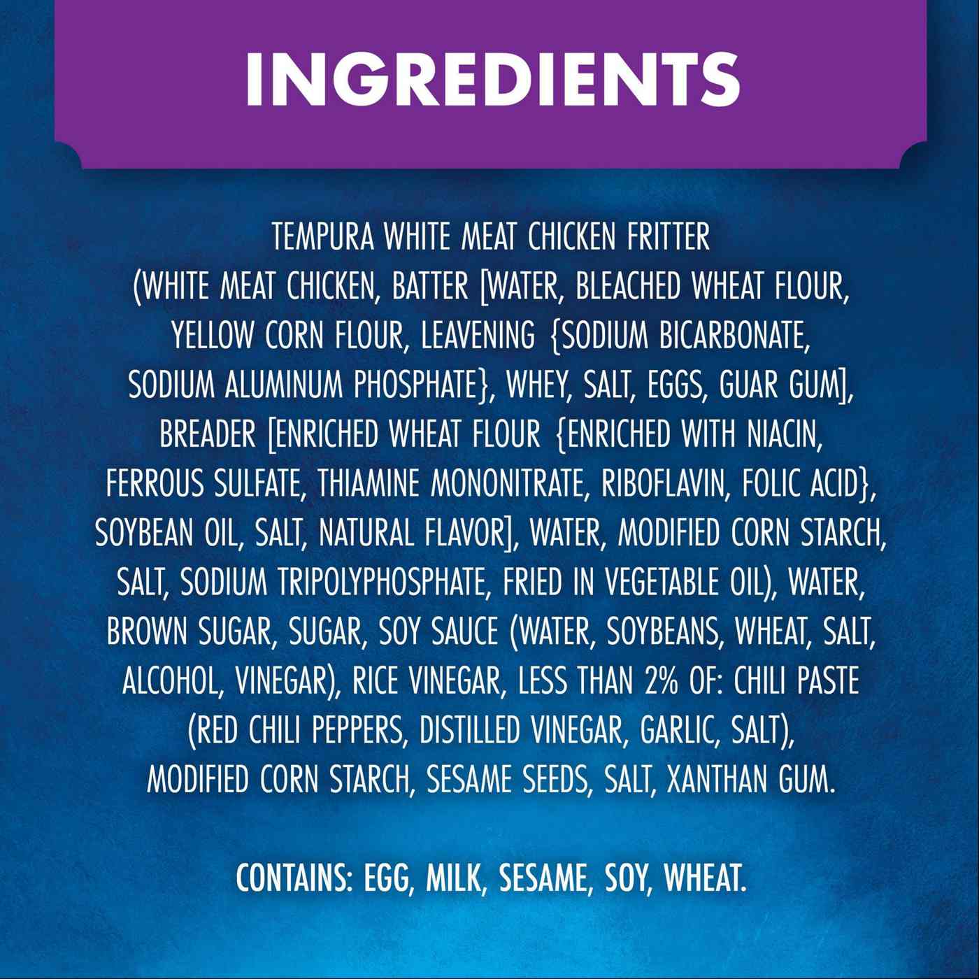 Tempura White Meat Chicken Fritter (White Meat Chicken, Batter [Water, Bleached Wheat Flour, Yellow Corn Flour, Leavening {Sodium Bicarbonate, Sodium Aluminum Phosphate}, Whey, Salt, Eggs, Guar Gum], Breader [Enriched Wheat Flour {Enriched with Niacin, Ferrous Sulfate, Thiamine Mononitrate, Riboflavin, Folic Acid} Soybean Oil, Salt, Natural Flavor], Water, Modified Corn Starch, Salt, Sodium Tripolyphosate, Fried in Vegetable Oil), Water, Brown Sugar, Sugar, Soy Sauce (Water, Soybeans, Wheat, Salt, Alcohol, Vinegar), Rice Vinegar, Less than 2% of: Chili Paste (Red Chili Peppers, Distilled Vinegar, Garlic, Salt), Modified Corn Starch, Sesame Seeds, Salt, Xanthan Gum.Allergens and safety warnings