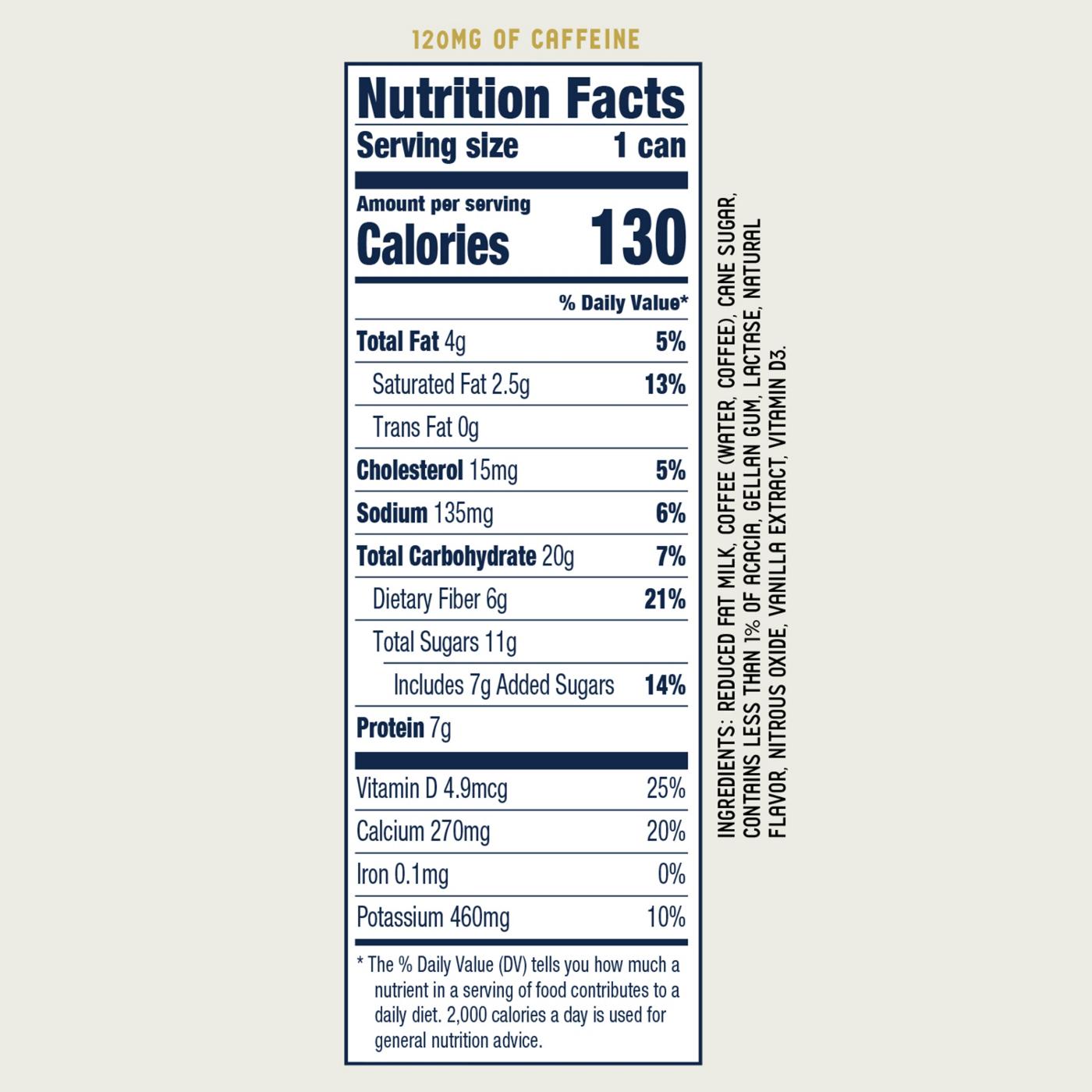 Reduced Fat Milk, Coffee (Water, Coffee), Cane Sugar, Contains Less than 1% of Acacia, Gellan Gum, Lactase, Natural Flavor, Nitrous Oxide, Vanilla Extract, Vitamin D3.