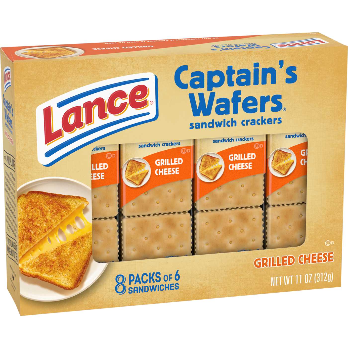Lance Captain's Wafers Grilled Cheese cracker creations make a wonderful savory snack. They feature two of our classic Captain's Wafers with real cheese filling for the taste of a grilled cheese sandwich. Ideal for just about any time you need a snack, in lunch boxes or your on-the-go bags. Bring it!GRILLED CHEESE SANDWICH CRACKERS: Classic Captain’s Wafers crackers with real cheese fillingMADE WITH REAL CHEESE: Made with a tasty, cheesy filling and crispy crackersON-THE-GO SNACK: Try these cracker packs for lunch breaks, afternoon snacks, and on the goFLAVORFUL SNACK: Snack on these delicious sandwich crackers to help keep you satisfied6 CRACKER PACKS: Package of 8 single-serve cracker snack packs, 6 sandwich crackers per packBRING IT!: Portable snacks, so you’re good to go, wherever you go