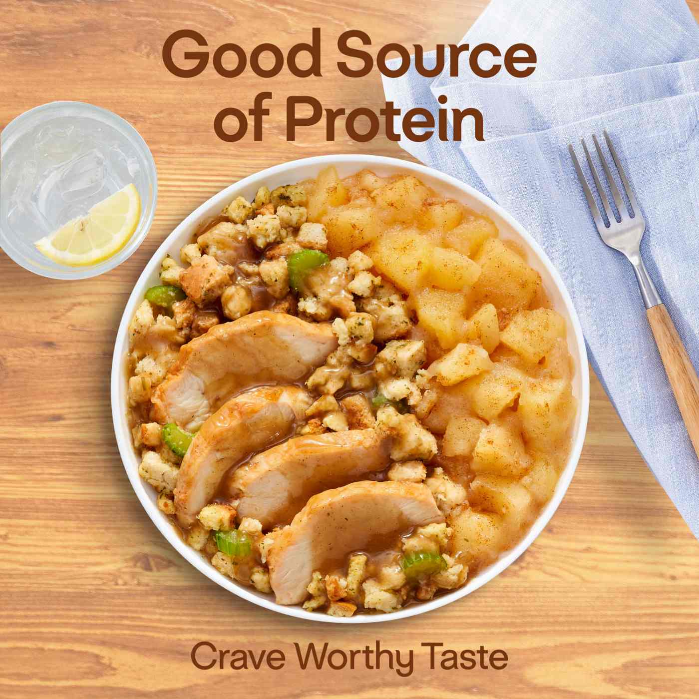 CINNAMON APPLES: APPLES, SUGAR, MODIFIED FOOD STARCH, WATER, APPLE JUICE, CITRIC ACID, SALT, MOLASSES, SPICES. GRAVY: WATER, ONIONS, MODIFIED FOOD STARCH, CHICKEN BROTH, CHICKEN FAT, SOYBEAN OIL, WHEAT FLOUR, SPICES, SALT, POTASSIUM SALT, SEASONING (DRIED TURKEY BROTH, SALT, FLAVORING, INSTANT COFFEE, SESAME OIL, SUNFLOWER OIL, ONION JUICE CONCENTRATE), MALTODEXTRIN, MUSHROOM JUICE CONCENTRATE, CARAMEL COLOR, DRIED GARLIC, DRIED ONIONS. TURKEY TENDERLOINS (COOKED TURKEY TENDERLOINS, WATER, MODIFIED CORNSTARCH, SEASONING [AUTOLYZED YEAST EXTRACT, MALTODEXTRIN, SALT, TURKEY FLAVOR, TURKEY STOCK, FLAVOR, GUM ARABIC], CARRAGEENAN, CANOLA OIL, SODIUM PHOSPHATE, NATURAL FLAVORING, SALT, POTASSIUM CHLORIDE, PAPRIKA) DRESSSING: BREAD CRUMBS (ENRICHED WHEAT FLOUR [WHEAT FLOUR, NIACIN, REDUCED IRON, THIAMINE MONONITRATE, RIBOFLAVIN, FOLIC ACID], CANE SUGAR, SOYBEAN OIL, SEA SALT, YEAST, NATURAL FLAVOR), CELERY, ONIONS.Allergens and safety warnings