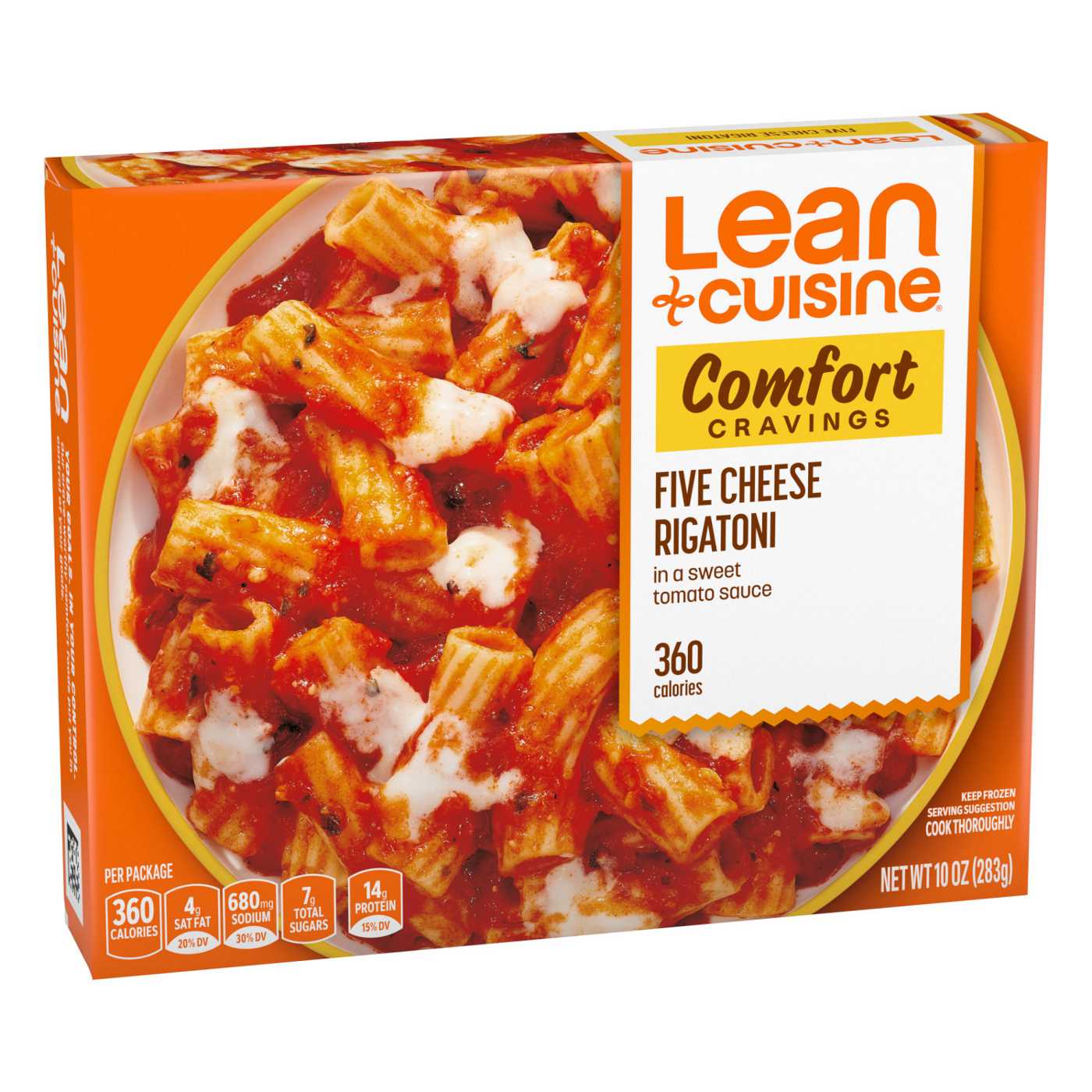 • MAKE YOUR GOALS DELICIOUSLY ACHIEVABLE: Lean Cuisine Five Cheese Rigatoni is deliciously crafted to help support your weight loss journey, and is an easy frozen lunch or dinner• CHEF CRAFTED: Our chefs work side-by-side with dietitians to create ridiculously tasty frozen Lean Cuisine meals. This dish features rigatoni pasta that is made fresh daily, covered in sweet tomato sauce & cheese• LOSE UP 18LBS IN 12 WEEKS*: Progress never tasted this good.*On average, lose 1-2 lbs. per week as part of a calorie-restricted diet with regular exercise.• CALORIE CONSCIOUS: At 350 calories per serving, you can feel good about every bite of our rigatoni frozen dinner. Lean Cuisine frozen meals are a delicious way to achieve your goals• MACROS THAT FIT YOUR PLAN: This microwave dinner is ready in 6 minutes, delivers 14g of protein per serving and is a good source of calcium• FROZEN INDIVIDUAL MEALS MADE FOR REAL LIFE: Lean Cuisine makes staying on track feel effortless. Our variety of frozen meals empowers you to eat well without having to sacrifice taste, convenience or nutrition