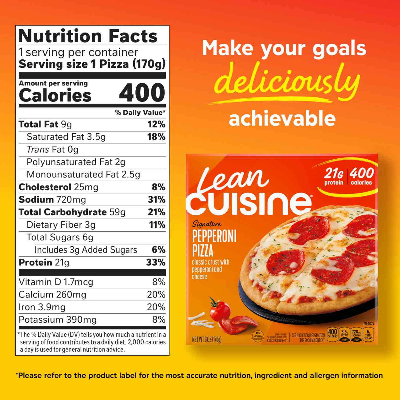 • MAKE YOUR GOALS DELICIOUSLY ACHIEVABLE: Lean Cuisine Pepperoni Pizza is deliciously crafted to help support your weight loss journey. Pair this pizza with a salad for an easy frozen lunch or dinner• CHEF CRAFTED: Our chefs work side-by-side with dietitians to create ridiculously tasty frozen Lean Cuisine meals. This personal pizza features dough made from scratch, topped with pepperoni and cheese, and baked to perfection• LOSE UP 18LBS IN 12 WEEKS*: With Lean Cuisine personal meals, progress never tasted this good. Lose up to 18lbs in 12 weeks *as a part of a calorie-restricted diet with regular exercise• CALORIE CONSCIOUS: At 400 calories per serving, you can feel good about every bite of our pizza. Lean Cuisine is a delicious way to achieve your goals• MACROS THAT FIT YOUR PLAN: This personal pizza delivers 21g of protein per serving, is a good source of calcium, and contains 9g of fat• FROZEN INDIVIDUAL MEALS MADE FOR REAL LIFE: Lean Cuisine makes staying on track feel effortless. Our variety of frozen meals empowers you to eat well without having to sacrifice taste, convenience or nutrition