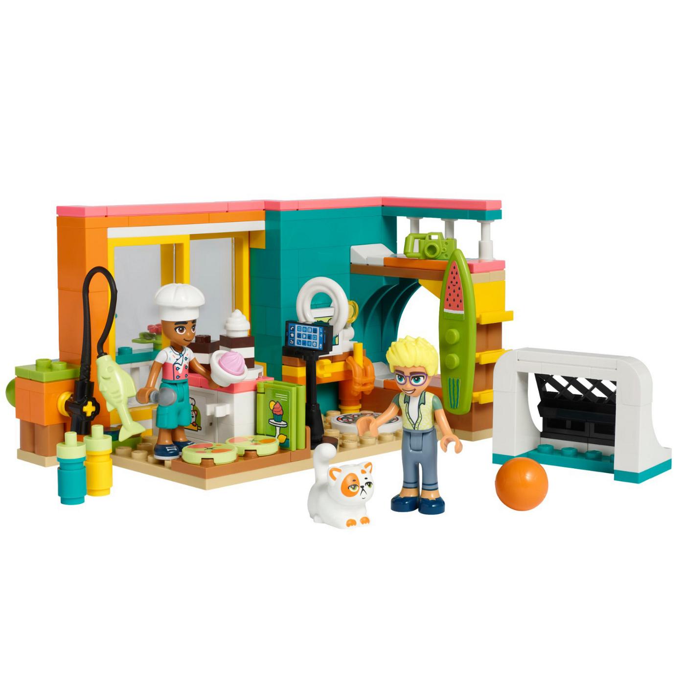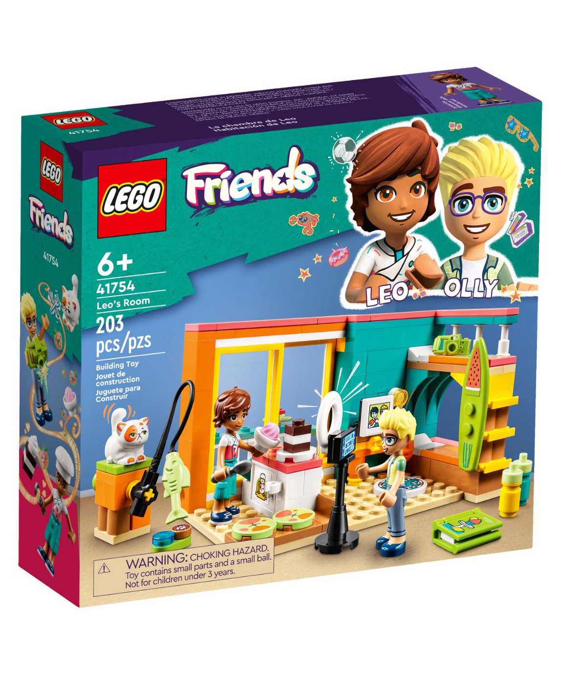 203 pieces. Whether they love baking, creative play or both, kids aged 6+ have lots to discover in this LEGO Friends Leo's Room (41754) building toy set. Leo has made a studio in his bedroom to film content for his baking channel. Kids will love joining Leo and Olly in their creative pursuits. Olly is an expert in video-making so is the perfect friend to help Leo. There are lots of features and accessories to inspire role play, including a cat toy, cookbook and camera. When filming is done for the day, kids can open the balcony doors so the friends can enjoy seaside views from the beach-themed bedroom.