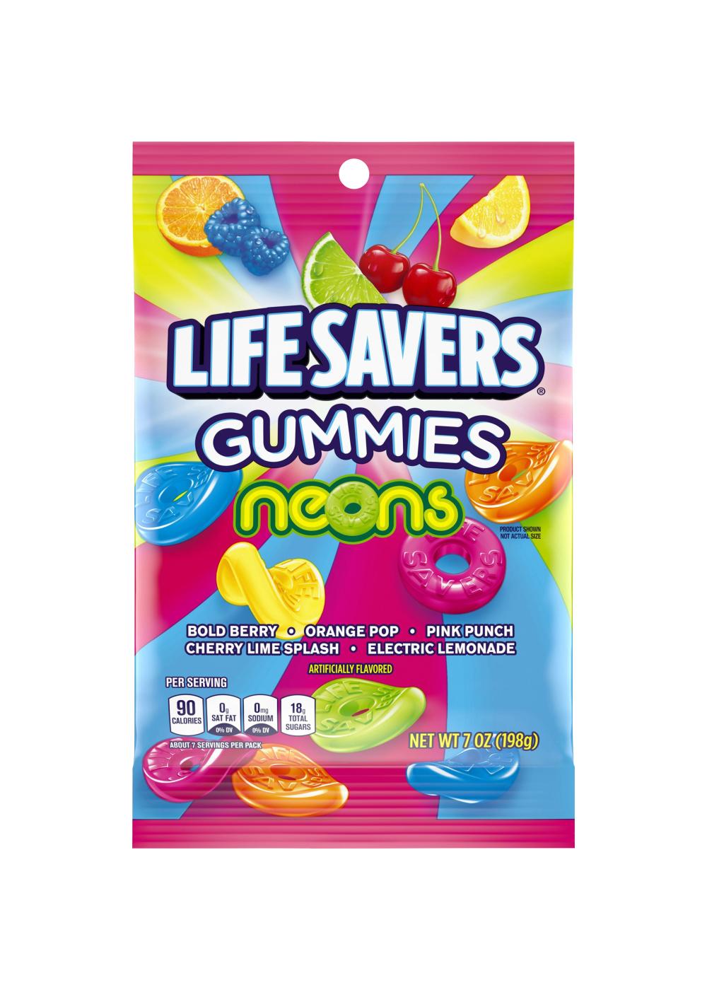 Who could resist the simple joy of the soft, chewy, fruity goodness of LIFE SAVERS Gummies? Who would want to? Light up your taste buds with LIFE SAVERS Neons Gummies Candy. Featuring bold berry, orange pop, pink punch, cherry lime splash and electric lemonade flavors, these colorful candies are sure to brighten your day. Keep a pack of these gummies in your desk for a chewy afternoon treat to enjoy during the workday. Make game night or movie night even better when you bring along delicious LIFE SAVERS Neons Gummies Candy to share. Send these packs of chewy gummies to loved ones in care packages or stock up the pantry at home or the office with fresh flavor. Create unique arts and crafts projects using colorful LIFE SAVERS Gummies. There are endless ways to add “a hole lot o fun” to your day with LIFE SAVERS Neons Gummies Candy.