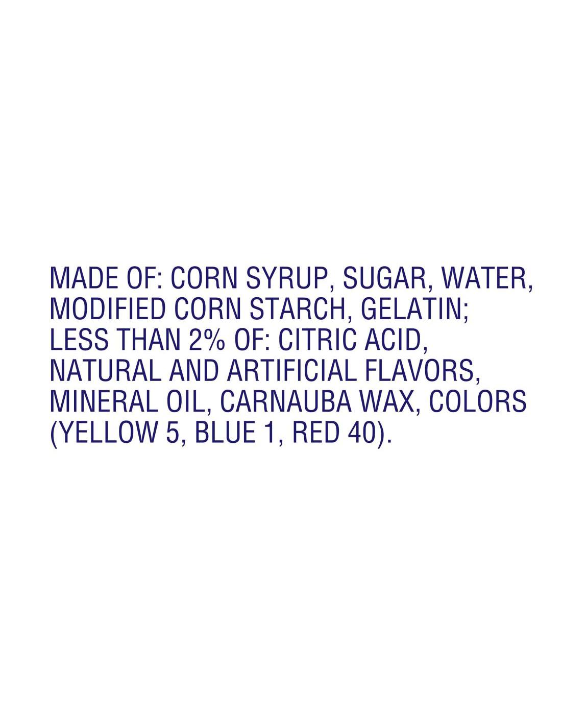 Corn Syrup, Sugar, Water, Modified Corn Starch, Gelatin; Less Than 2% Of: Citric Acid, Natural And Artificial Flavors, Mineral Oil, Carnauba Wax, Colors (Yellow 5, Blue 1, Red 40).