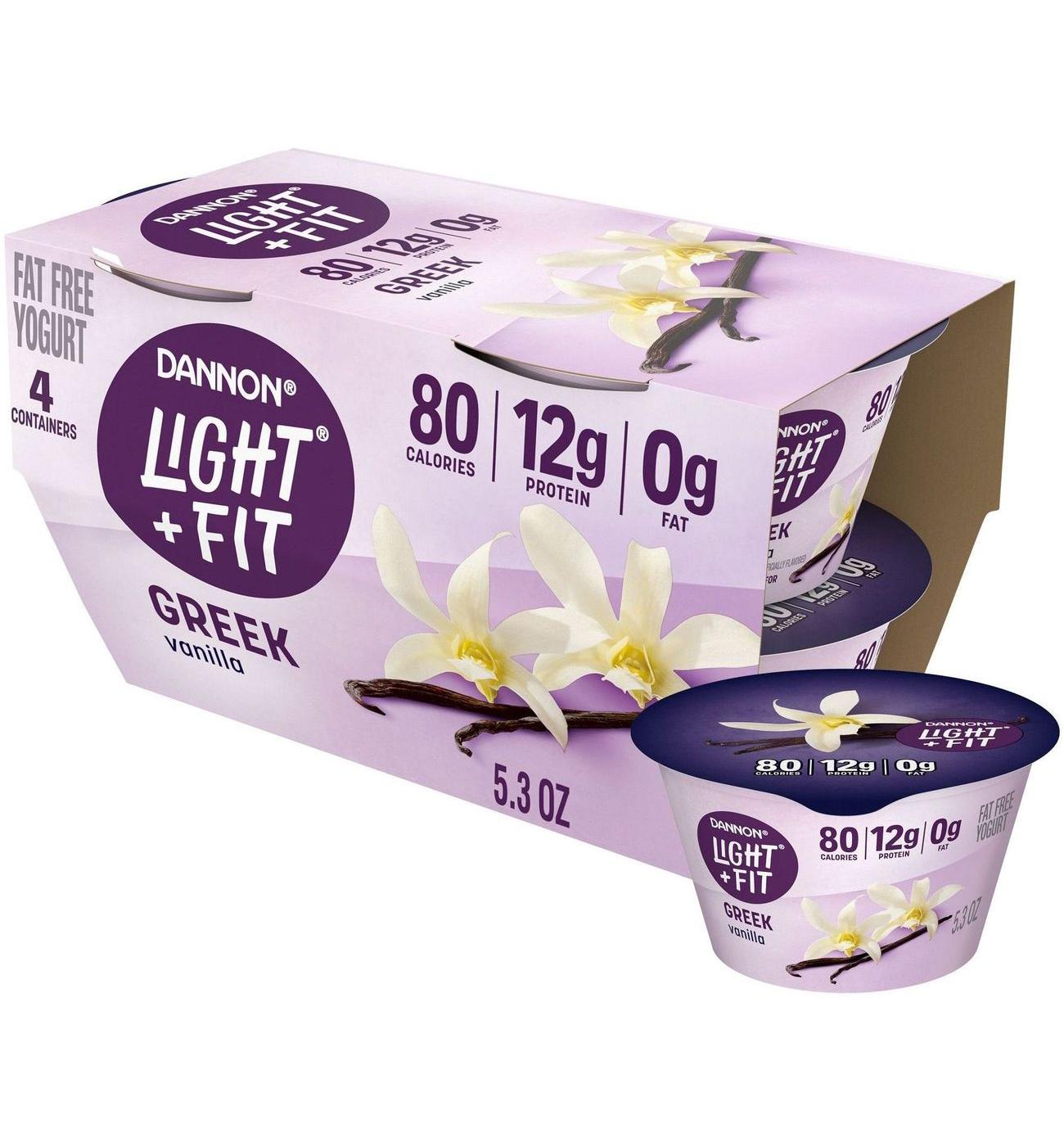 Looking for a gluten free, fat free yogurt with crave-able vanilla flavor? Give your taste buds a reason to rejoice with a four-pack of Dannon Light + Fit Vanilla Greek Fat Free Yogurt Cups. Every bite of this Vanilla flavored yogurt makes it easy to enjoy fat free snacks with this delicious light yogurt brand*. Our fat free Greek yogurt comes in single-serve cups, so you can live your life uninterrupted and enjoy them on the go. Protein is an essential nutrient we need in our diets, and with 80 calories and 12g of protein per 5.3 ounce serving, this Light + Fit yogurt cup is a deliciously satisfying and convenient option for adding complete protein every day. Add flavor to your day, every day, with a single serving snack cup of Dannon Light + Fit Vanilla Greek Fat Free Yogurt. *At least 50% less fat than average flavored Greek yogurt; Light & Fit: 80 calories, 0g fat; Average flavored Greek yogurt: 110 calories, 1g fat per 5.3 oz serving.