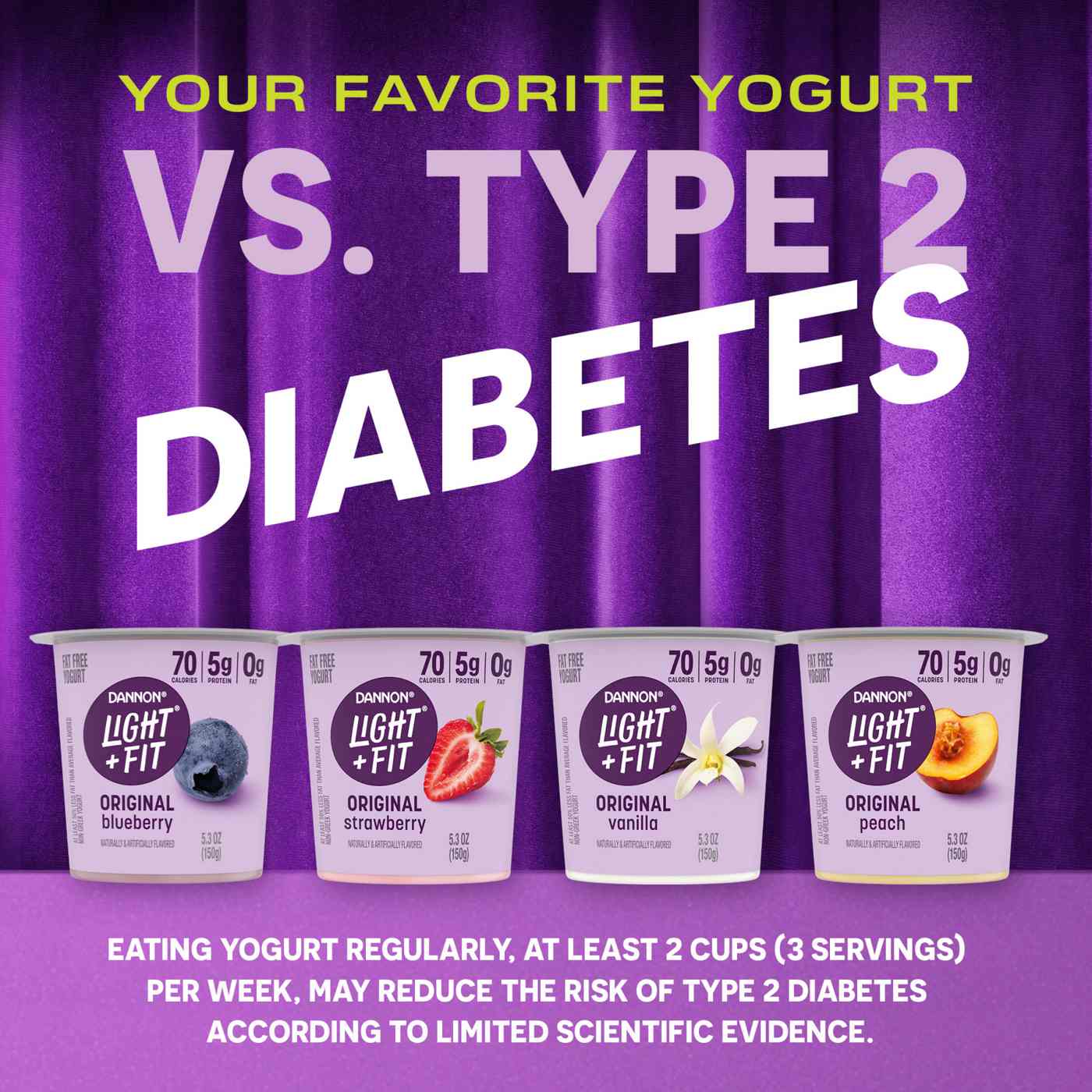 • Yogurt and Type 2 Diabetes: Eating yogurt regularly, at least 2 cups (3 servings) per week, may reduce the risk of type 2 diabetes according to limited scientific evidence• Just Grab Your Spoon and Enjoy: Four 5.3 oz Dannon Light + Fit Peach Original Fat Free Yogurt Cups• Provides 5g Protein: Per serving and can be added into protein shakes or smoothies• Great for Gluten-Free Lifestyles: Tasty gluten free snacks that can fit into a healthy, active routine• Serving Balance: With 0g fat per serving – great as a fat free snack or a creamy dessert