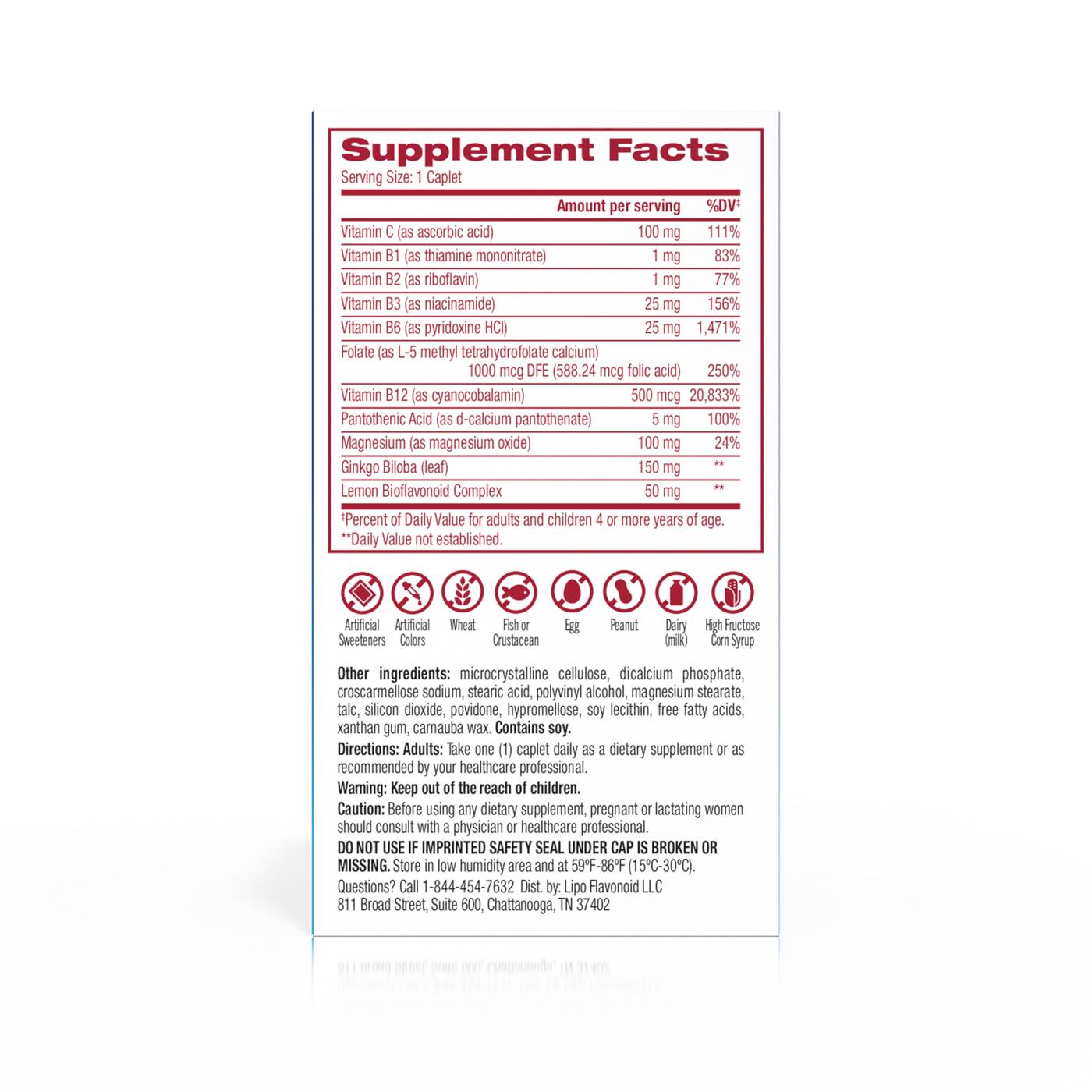 Other Ingredients: Microcrystalline Cellulose, Dicalcium Phosphate, Croscarmellose Sodium, Stearic Acid, Polyvinyl Alcohol, Magnesium Stearate, Talc, Silicon Dioxide, Povidone, Hypromellose, Soy Lecithin, Free Fatty Acids, Xanthan Gum, Carnauba Wax.Allergens and safety warnings