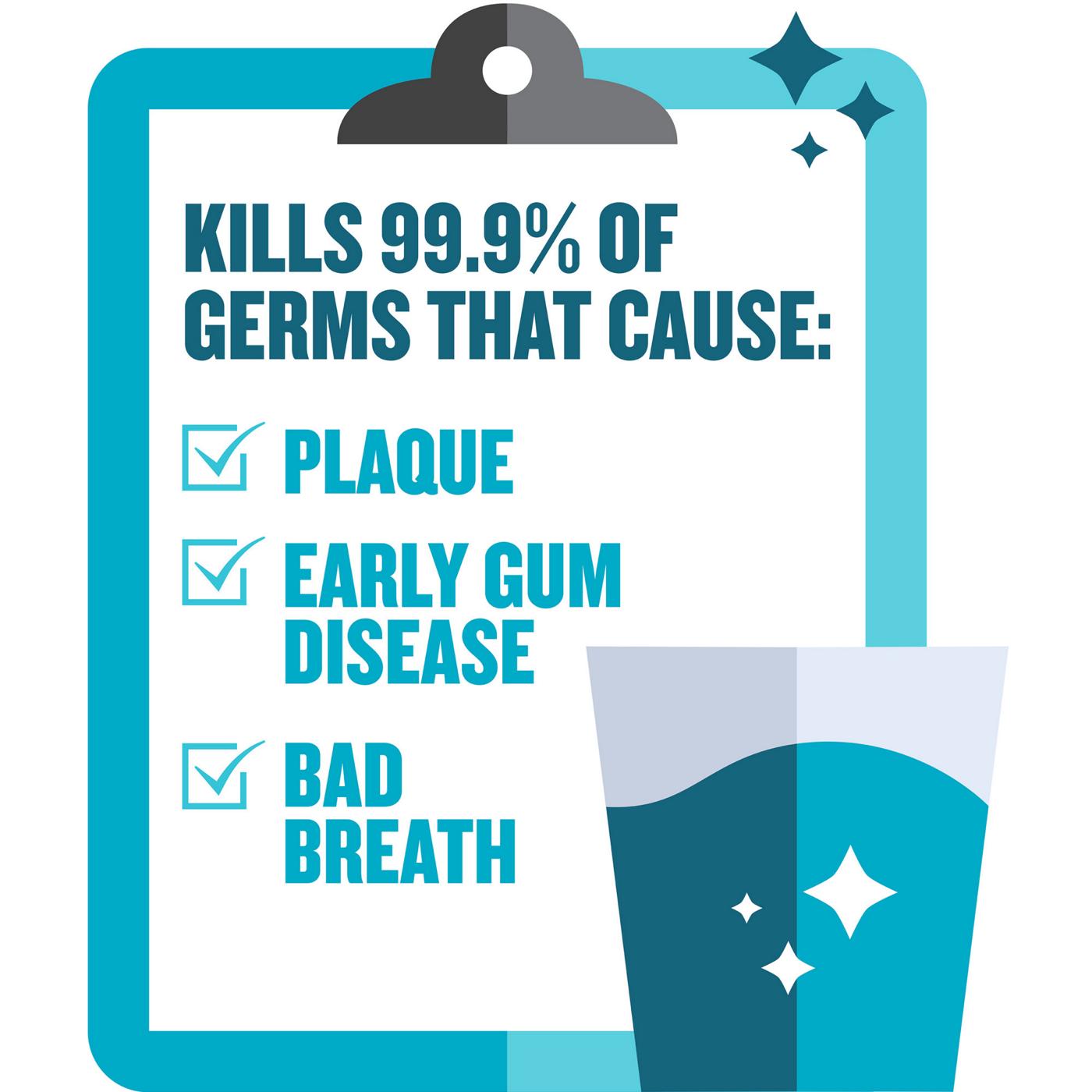 Listerine Cool Mint antiseptic mouthwash kills 99.9% of germs that cause bad breath, plaque and gingivitis. Use oral rinse twice daily for a fresher and cleaner mouth than brushing alone.- Antiseptic mint mouthwash for bad breath- Oral rinse helps reduce plaque and gingivitis- Rinse for a cleaner mouth and fresh breath