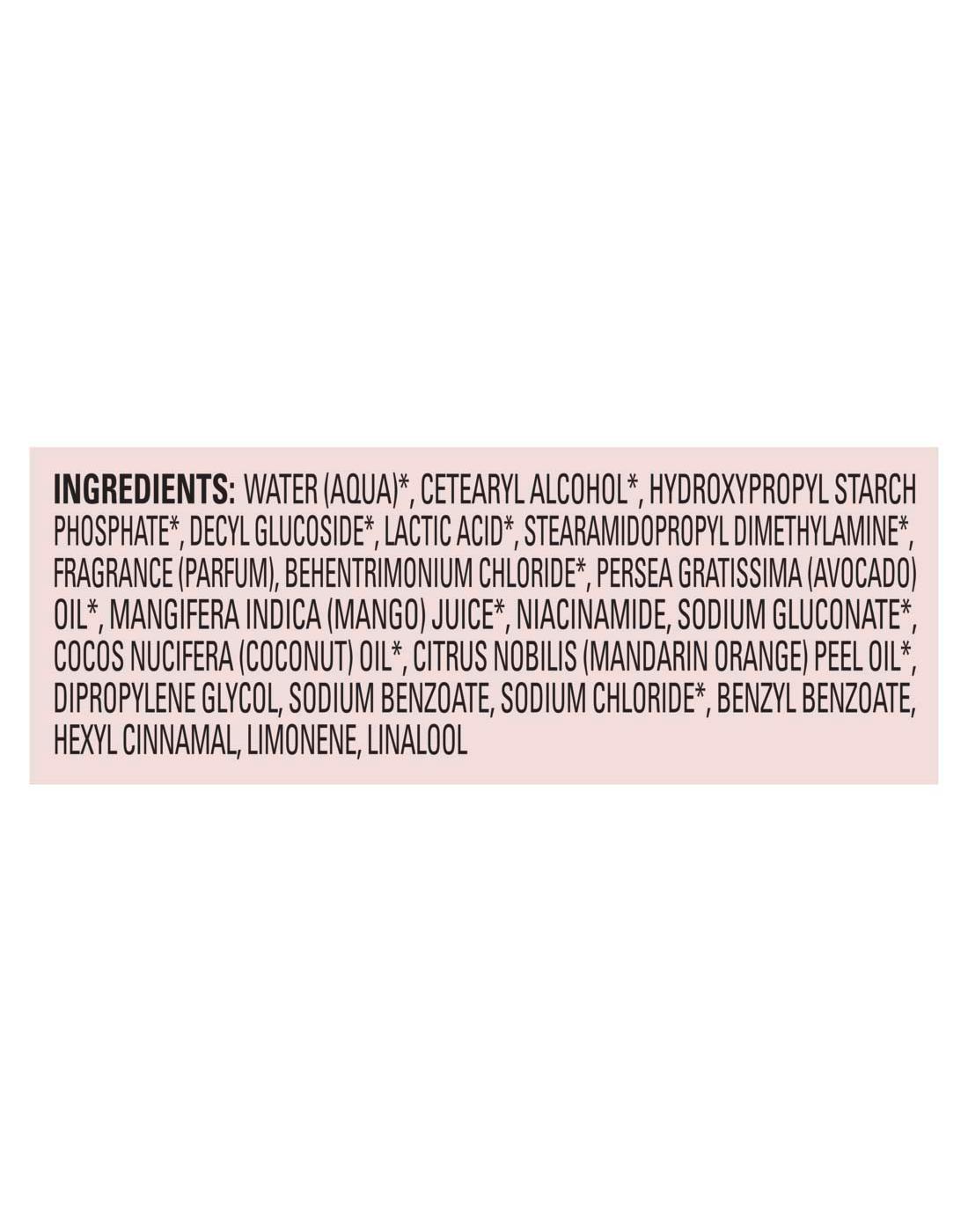 Water (Aqua) (Naturally-Derived Ingredients), Cetearyl Alcohol (Naturally-Derived Ingredients), Hydroxypropyl Starch Phosphate (Naturally-Derived Ingredients), Decyl Glucoside (Naturally-Derived Ingredients), Lactic Acid (Naturally-Derived Ingredients), Stearamidopropyl Dimethylamine (Naturally-Derived Ingredients), Fragrance (Parfum), Behentrimonium Chloride (Naturally-Derived Ingredients), Persea Gratissima (Avocado) Oil (Naturally-Derived Ingredients), Mangifera Indica (Mango) Juice (Naturally-Derived Ingredients), Niacinamide, Sodium Gluconate (Naturally-Derived Ingredients), Cocos Nucifera (Coconut) Oil (Naturally-Derived Ingredients), Citrus Nobilis (Mandarin Orange) Peel Oil (Naturally-Derived Ingredients), Dipropylene Glycol, Sodium Benzoate, Sodium Chloride (Naturally-Derived Ingredients), Benzyl Benzoate, Hexyl Cinnamal, Limonene, Linalool.