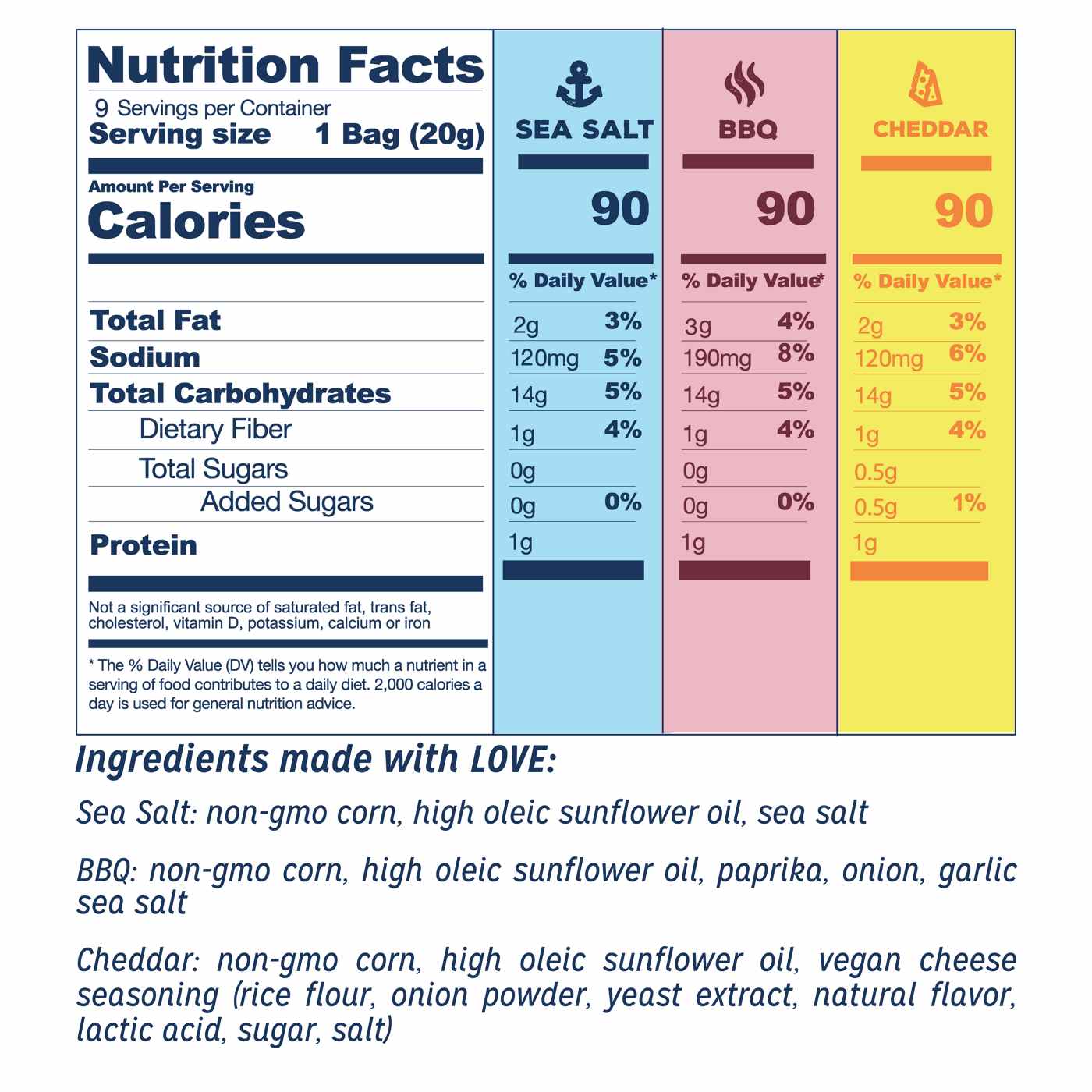 Sea Salt: Corn, high oleic sunflower oil, sea salt. BBQ: Corn, high oleic sunflower oil, paprika, onion, garlic, sea salt. Cheddar: Corn, high oleic sunflower oil, cheese flavor seasoning (Rice flour, onion powder, yeast extract, natural flavor, lactic acid, sugar, salt).Allergens and safety warnings