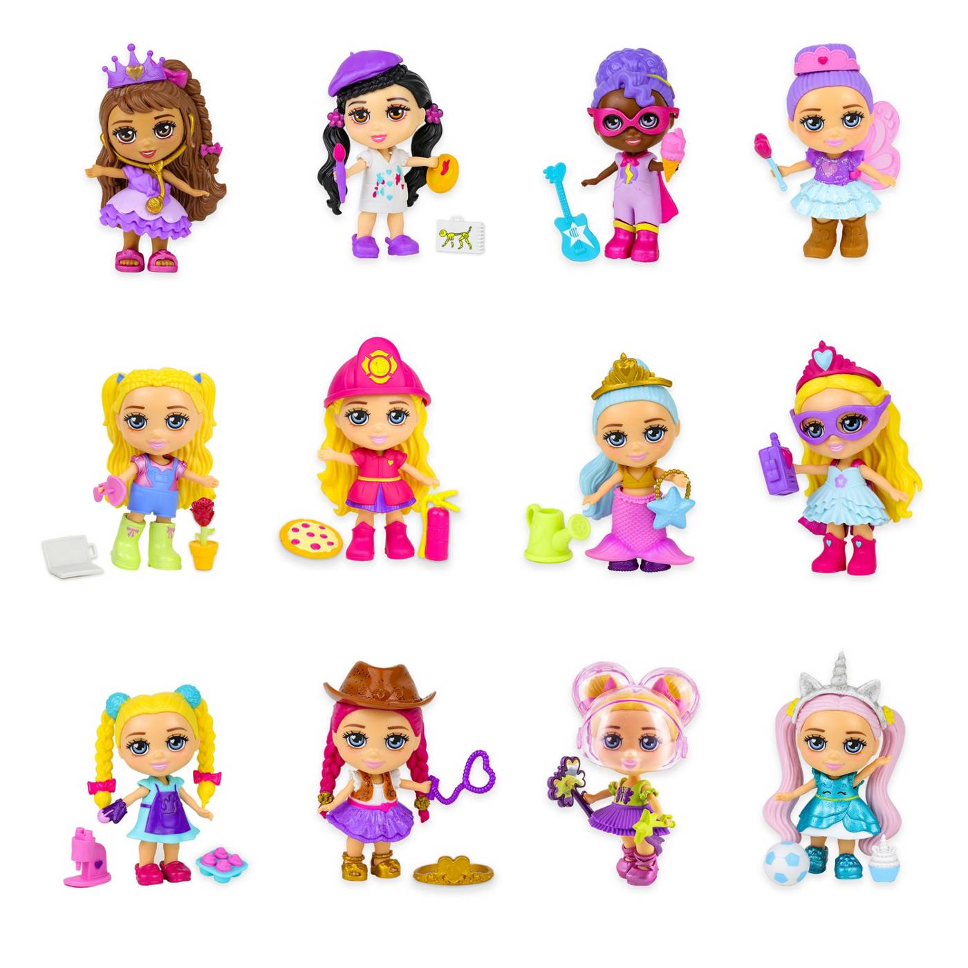 Fill in gems with glitter putty. Fashion fabulous surprises in each. 3.5 inch doll. Tiara. Purse. Shoes. Scented doll & outfit. Wand. Glitter putty. Stickers.