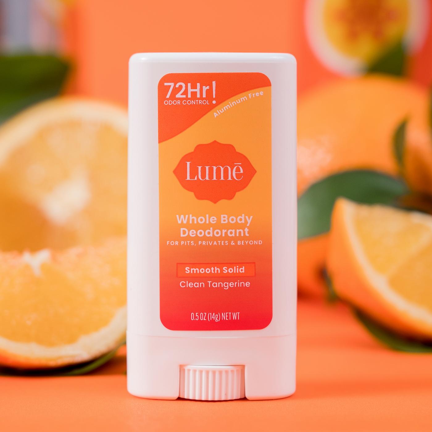• SMELL BETTER EVERYWHERE. Odor control for pits, privates and beyond—think feet, underboob, belly buttons, tummy folds, butt cracks, thigh creases or anywhere else you have odor but wish you didn't.• OUTRAGEOUSLY EFFECTIVE. Lume Deodorant is clinically proven to control odor for 72 hours.• POWERED BY SCIENCE. Our formula is pH optimized to block odor before it starts. You could even call us a PREodorant!• VISUALLY EVENS SKIN TONE. Clinically proven to exfoliate and reduce the appearance of hyperpigmentation. Formulated without aluminum, baking soda, dyes, and parabens. Skin loving for even our most sensitive parts. Hypoallergenic, vegan, and cruelty free.• CLEAN TANGERINE. With sparkling, bright, citrus notes, this sweet and fruity scent is pure sunshine. Our Smooth Solid glides on smoothly, anywhere you want to control odor.• OB/GYN DEVELOPED. DERMATOLOGIST TESTED.