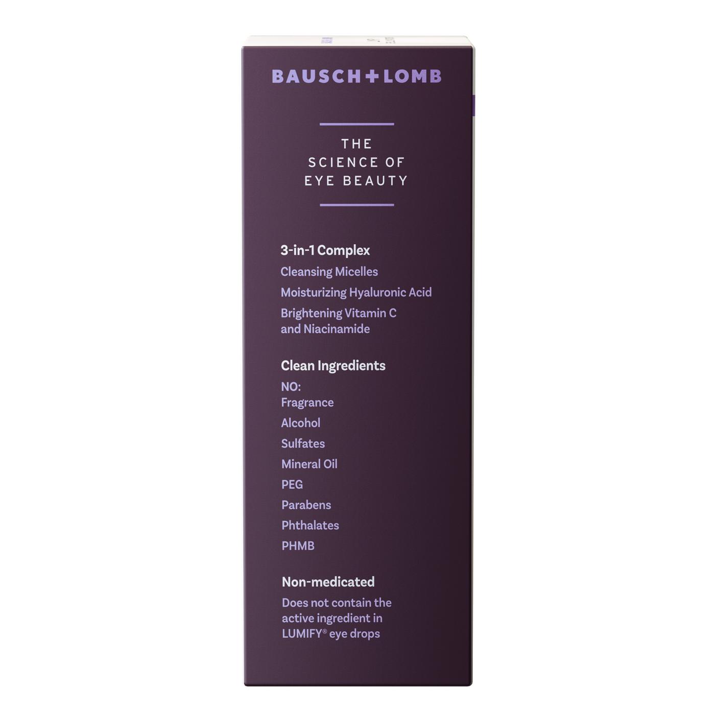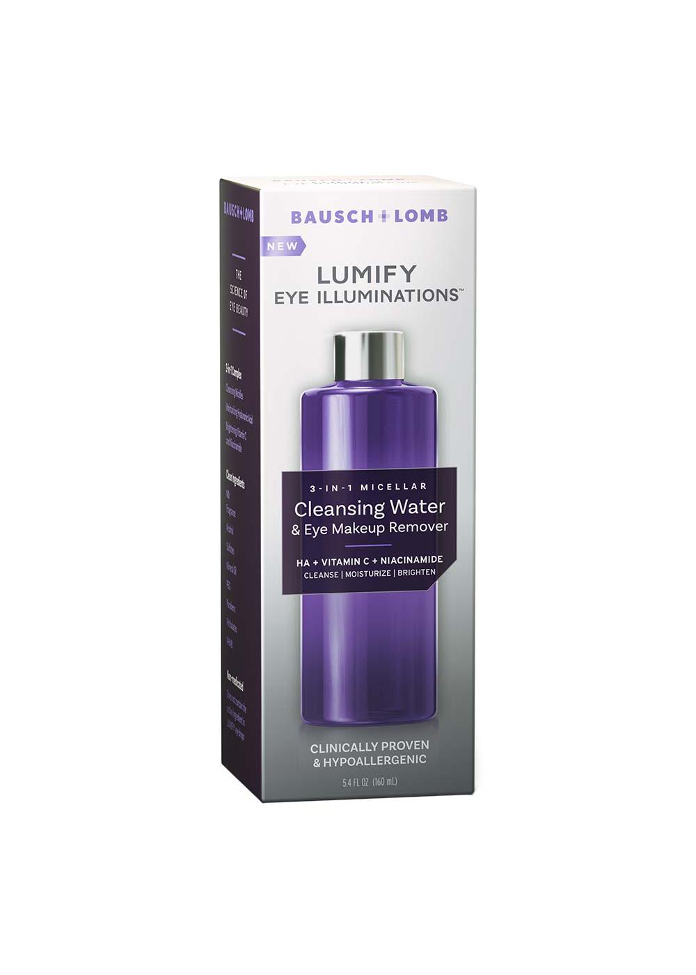 LUMIFY Eye Illuminations Cleansing Water & Eye Makeup Remover, 3-in-1 Micellar Water Contains Hyaluronic Acid, Vitamin C & Niacinamide, Clinically Proven & Hypoallergenic, Contact Lens & Lash Extension Friendly. REJUVENATING MICELLAR FORMULA: Patent-pending, no-rinse micellar formula helps provide powerful cleansing while Hyaluronic Acid, Vitamin C and Niacinamide help brighten and moisturize the sensitive skin around the eyes. WATERPROOF MAKEUP REMOVER + EYE LIDS CLEANSER: pH balanced to be non-irritating to the eyes. Eye makeup remover liquid helps remove even waterproof makeup without harsh rubbing. THE SCIENCE OF EYE BEAUTY: Scientifically developed with Ophthalmologists and Dermatologists specifically for the sensitive area around the eye. Brought to you by the eye care experts at Bausch + Lomb. CLEAN INGREDIENTS: This hypoallergenic formula is free of fragrance, alcohol, sulfates, mineral oil, PEG, parabens, phthalates, PHMB.