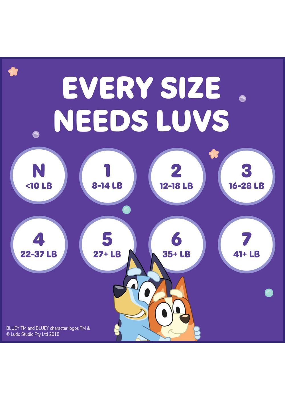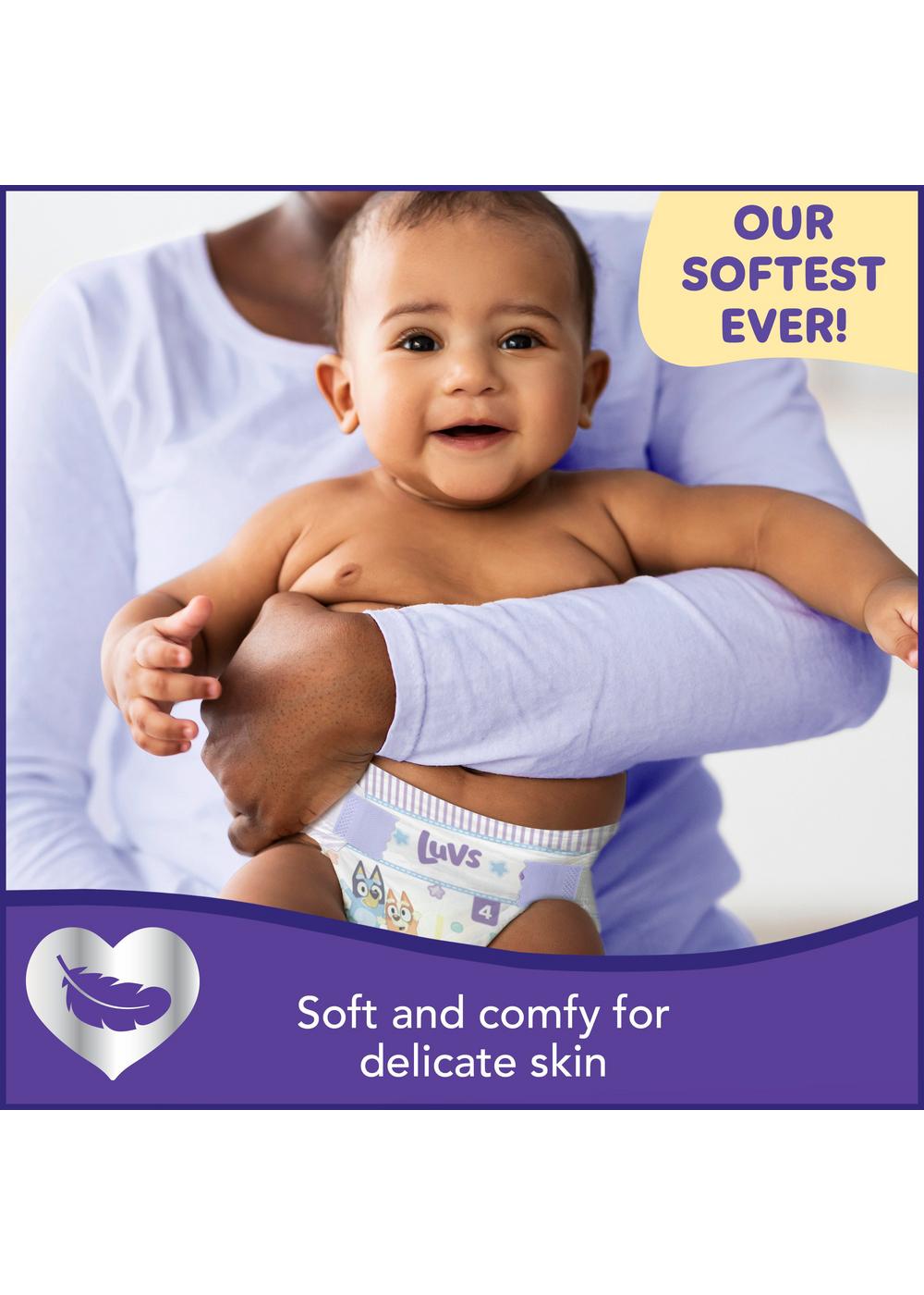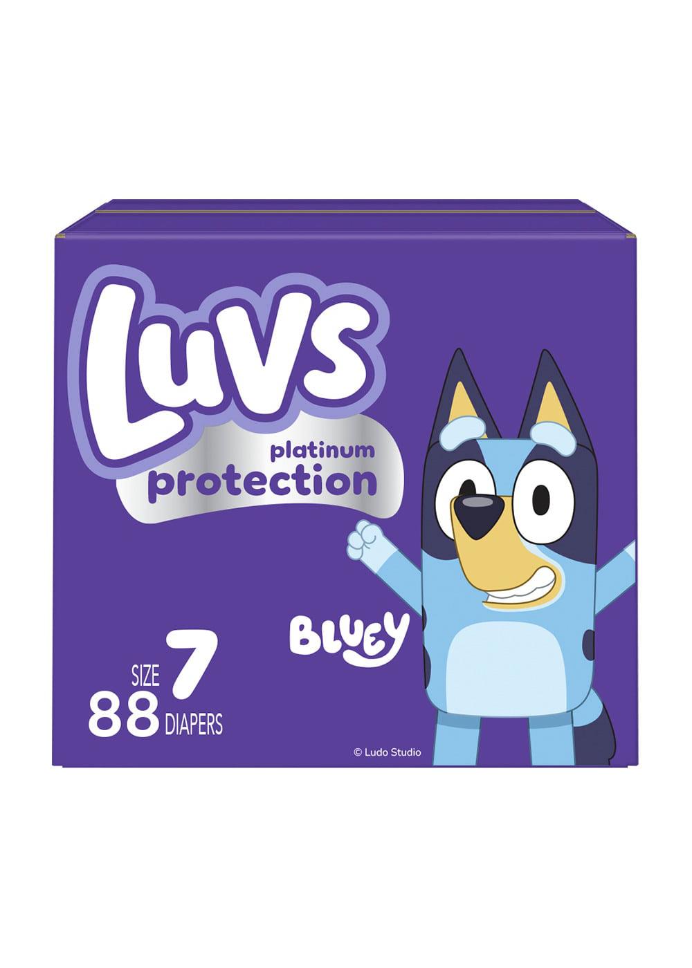 Introducing Luvs Platinum Protection featuring Bluey! Luvs disposable diapers are now better than ever* and have up to 12-hours of Triple Leakguard Protection. But our leak protection doesn’t stop there. Secure cuffs and stretchy sides keep leaks locked in where they happen the most. New Luvs Platinum Protection is our softest ever! Feel the softness and bring a new level of comfort for baby’s delicate skin. Parenting can be stressful. Rest assured with worry-free Luvs Diapers and give your baby the gentle comfort he/she needs with the protection that parents trust. With Luvs Platinum Protection you know when they go, thanks to a wetness indicator that turns blue on contact with wetness. Plus, meet our new, best friend, Bluey. These adorably fun patterns give every diaper an added layer of cuteness to match your baby. Here are the highlights ... Four levels of protection: Triple Leakguards, wetness indicator, secure and stretchy sides, comfy leak barrier cuffs Max softness: Soft and comfy for your baby’s delicate skin It’s not a mystery that babies are pretty delicate, so these diapers are dermatologically tested, hypoallergenic, and free of parabens and latex.