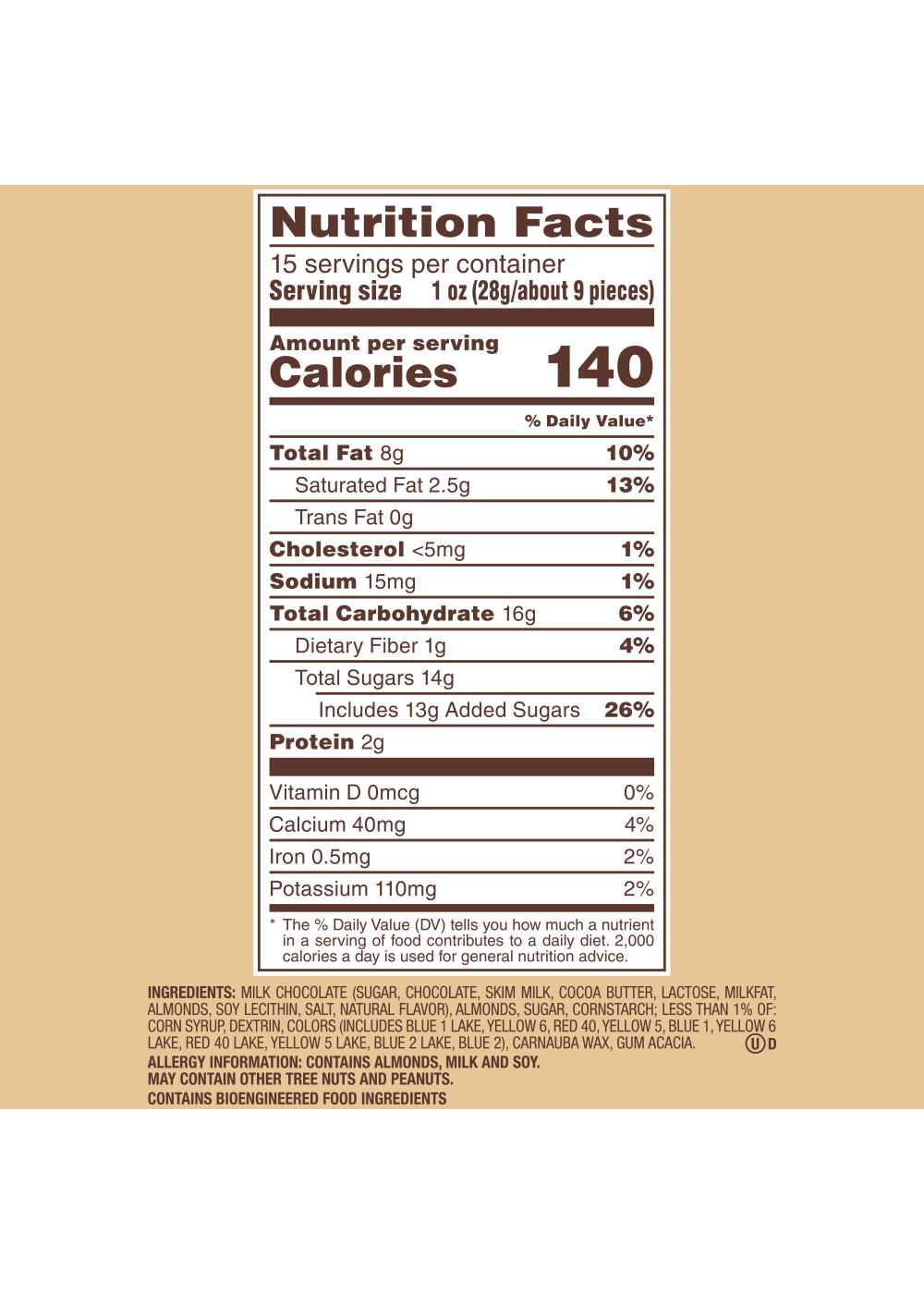 Milk Chocolate (Sugar, Chocolate, Skim Milk, Cocoa Butter, Lactose, Milkfat, Almonds, Soy Lecithin, Salt, Natural Flavor), Almonds, Sugar, Cornstarch; Less Than 1% Of: Corn Syrup, Dextrin, Colors (Includes Blue 1 Lake, Yellow 6, Red 40, Yellow 5, Blue 1, Yellow 6 Lake, Red 40 Lake, Yellow 5 Lake, Blue 2 Lake, Blue 2), Carnauba Wax, Gum Acacia.Allergens and safety warnings