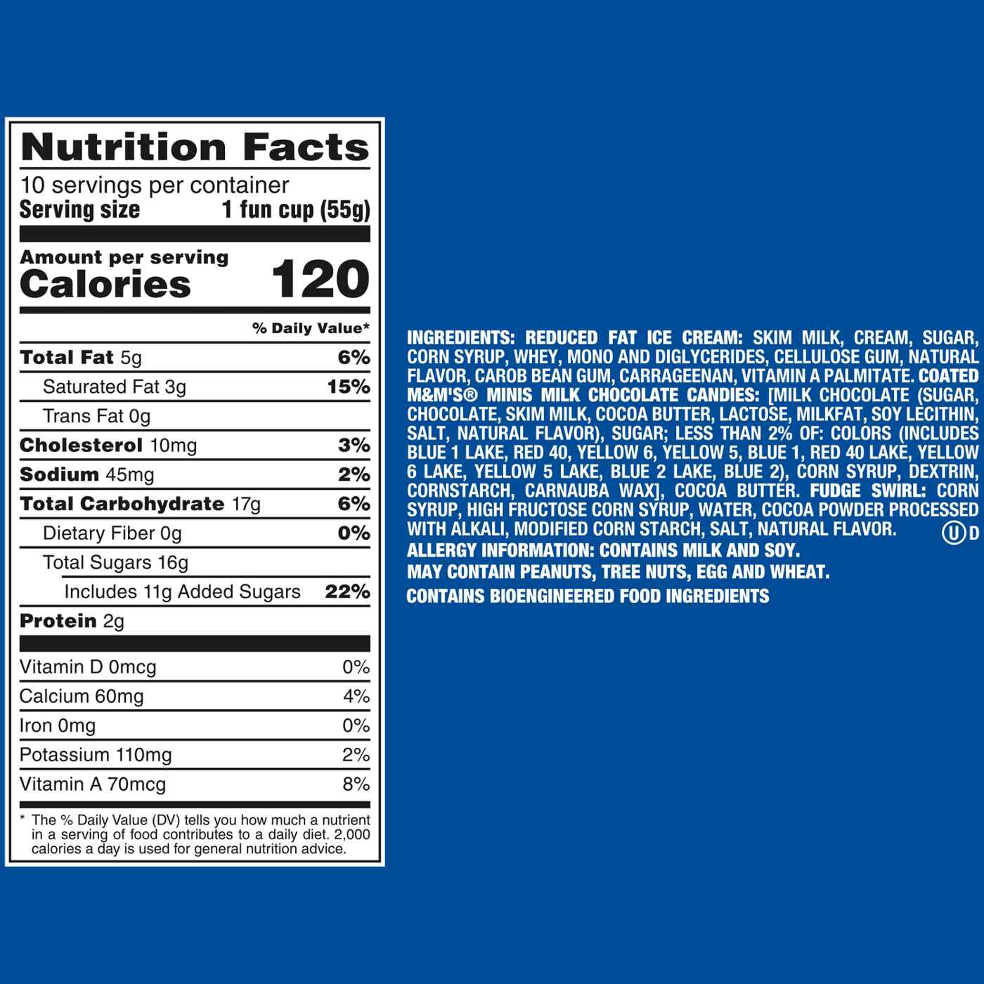 Reduced Fat Ice Cream: Skim Milk, Cream, Sugar, Corn Syrup, Whey, Mono and Diglycerides, Cellulose Gum, Natural Flavor, Carob Bean Gum, Carrageenan, Vitamin A Palmitate. Coated M&M's Minis Milk Chocolate Candies: [Milk Chocolate (Sugar, Chocolate, Skim Milk, Cocoa Butter, Lactose, Milkfat, Soy Lecithin, Salt, Natural Flavor), Sugar; Less than 2% of: Colors (Includes Blue 1 Lake, Red 40, Yellow 6, Yellow 5, Blue 1, Red 40 Lake, Yellow 6 Lake, Yellow 5 Lake, Blue 2 Lake, Blue 2), Corn Syrup, Dextrin, Cornstarch, Carnauba Wax], Cocoa Butter. Fudge Swirl: Corn Syrup, High Fructose Corn Syrup, Water, Cocoa Powder Processed with Alkali, Modified Corn Starch, Salt, Natural Flavor.Allergens and safety warnings