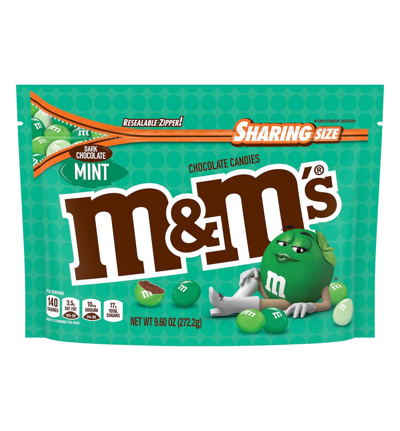 -Contains one 9.6-ounce sharing size bag of M&M'S Mint Dark Chocolate Candy-Made with real dark chocolate and mint flavor in green candy shells-These sharing-size candy bags make splitting Mint M&M's Chocolate fun and easy-Mix these tasty mint chocolate pieces into a milkshake for a refreshing chocolate treat-This convenient, resealable stand-up bag makes storage and sharing easy