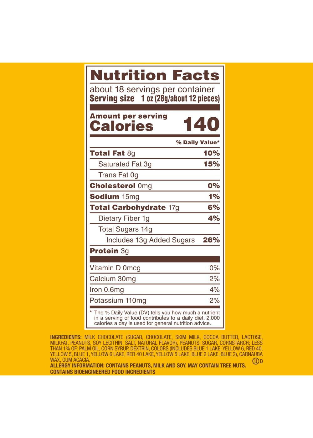 Milk Chocolate (Sugar, Chocolate, Skim Milk, Cocoa Butter, Lactose, Milkfat, Peanuts, Soy Lecithin, Salt, Natural Flavor), Peanuts, Sugar, Cornstarch; Less Than 1% Of: Palm Oil, Corn Syrup, Dextrin, Colors (Includes Blue 1 Lake, Yellow 6, Red 40, Yellow 5, Blue 1, Yellow 6 Lake, Red 40 Lake, Yellow 5 Lake, Blue 2 Lake, Blue 2), Carnauba Wax, Gum Acacia.Allergens and safety warnings