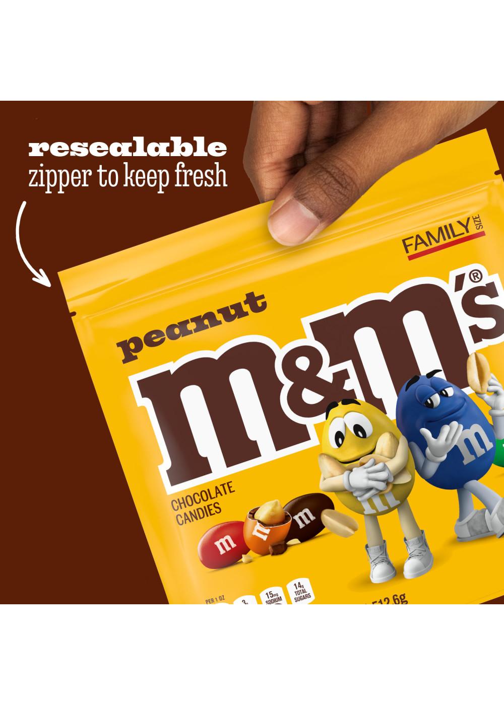 M&M'S Peanut Chocolate Candy is a little nutty, a lot tasty and always full of fun. Enjoy roasted peanuts covered in delicious chocolate and a colorful candy shell. Packaged in a resealable bag to keep the fun contained, this family-size bag of candy is ideal for keeping the pantry stocked for movie night and parties with friends. These colorful chocolate candies make great to-go treats, add-ins for baking and gift baskets. Remember M&M'S Candy for your next event or celebration.