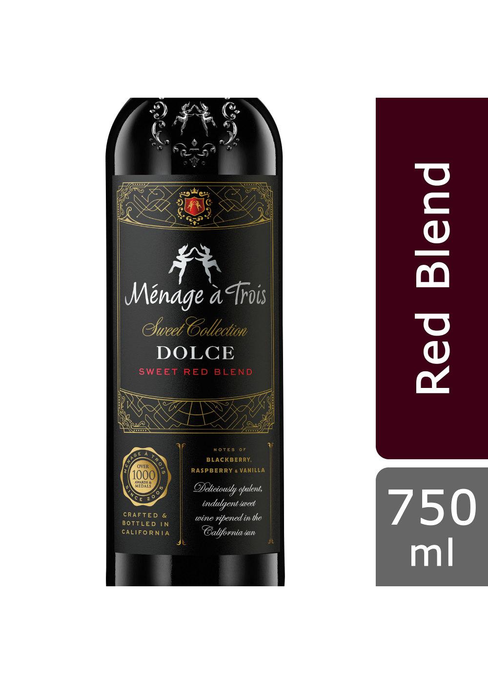 Experience the sweet life when you open a wine bottle of Menage a Trois Sweet Collection Dolce Sweet Red Wine. Brimming with decadent blackberry and raspberry flavors accented by warm notes of vanilla, this sweet red wine blend is lively on the palate, lifted by delicate, light carbonation and crisp acidity. Muscat lends its sweet notes for a decadent foundation followed by jammy fruit flavors from Zinfandel and bold, dark fruit character from Syrah for intensity and depth. This wine was awarded 90 Points by the Tasting Panel in the April/May 2021 issue. Pair this sweet red wine blend with chocolate desserts and spicy meats. Gentle wine making processes and cold fermentation help maintain the rich, sweet flavors and aromas of grapes sourced from California's best vineyards. This bottled wine has 9.5% alcohol by volume and features a screw cap for easy opening-no corkscrew required. Menage a Trois offers a robust portfolio of award-winning wines that consistently delight with a high-quality experience.