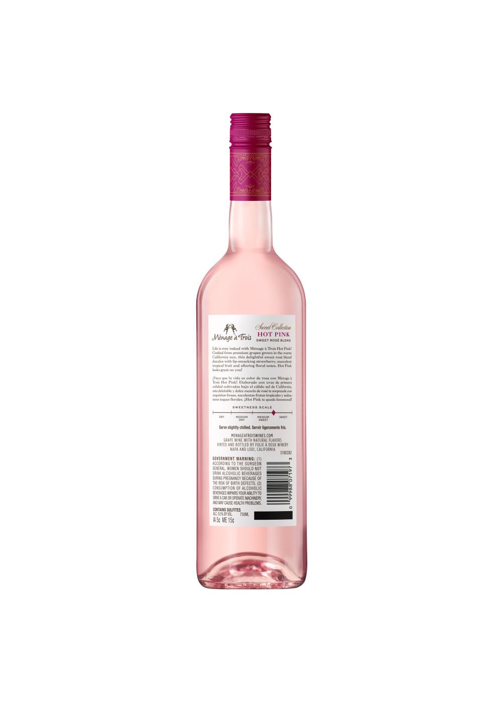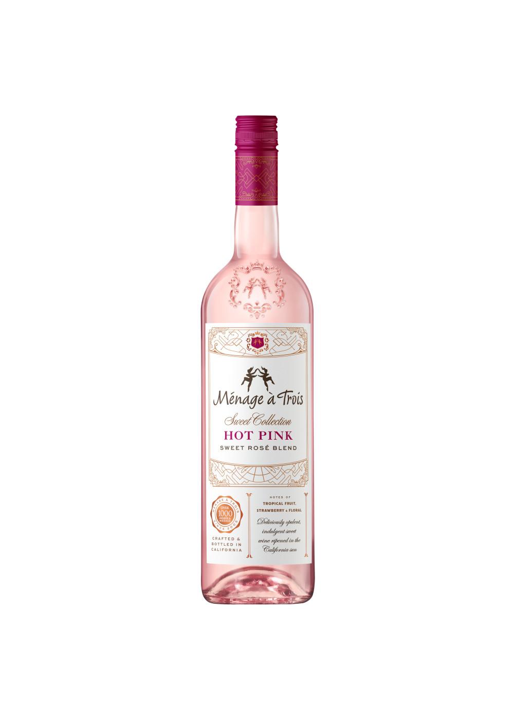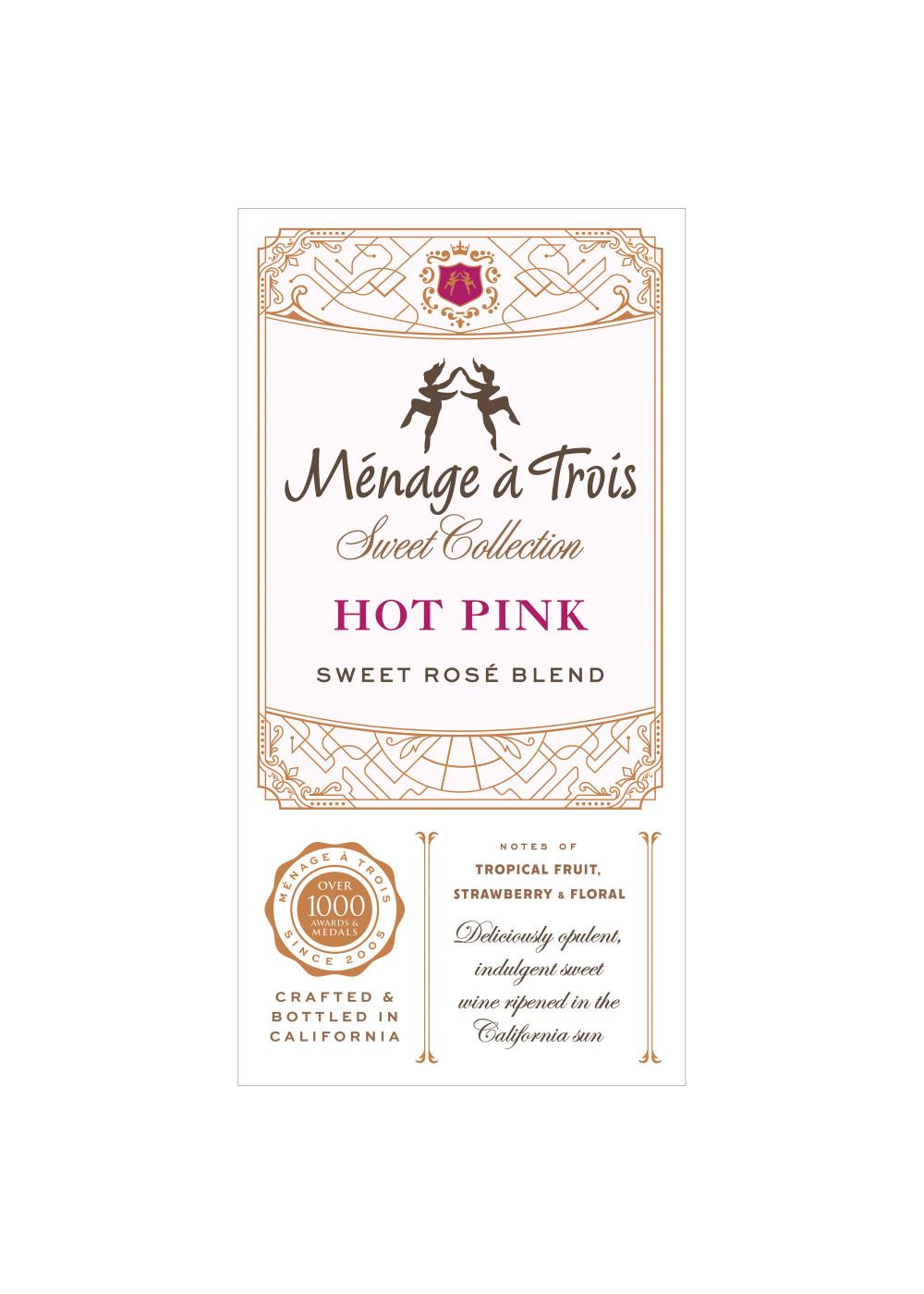 Life is rosy indeed with Ménage à Trois Hot Pink Rosé Wine! Crafted from premium grapes grown in the warm California sun, this delightful sweet rose blend dazzles with lip-smacking strawberry, succulent tropical fruit and alluring floral notes! Winemakers began with a rich white blend as the foundation for this sweet rosé blend and added French Colombard for brightness. To increase varietal intensity, winemakers cap and drain the grapes then cold-ferment the wine at 50º F to preserve the fresh fermentation aromas. 100% non-malolactic fermentation maintains crisp acidity, perfectly balancing the sweet, indulgent fruit flavors. To make Hot Pink even more appealing, winemakers elevated the carbonation and enhanced the wine with natural strawberry, raspberry and pineapple essence. This bottle of wine has 9.5% alcohol by volume.
