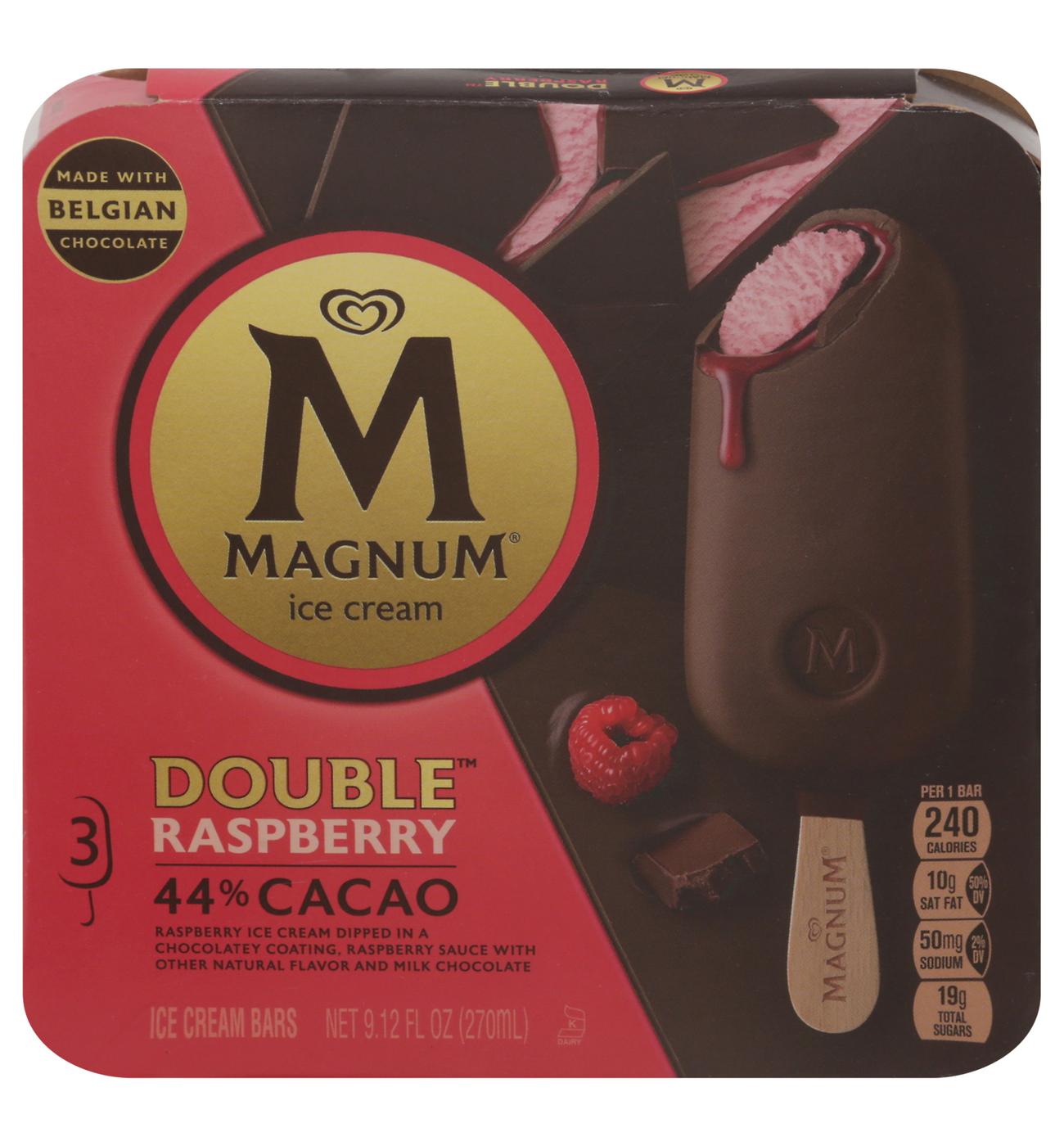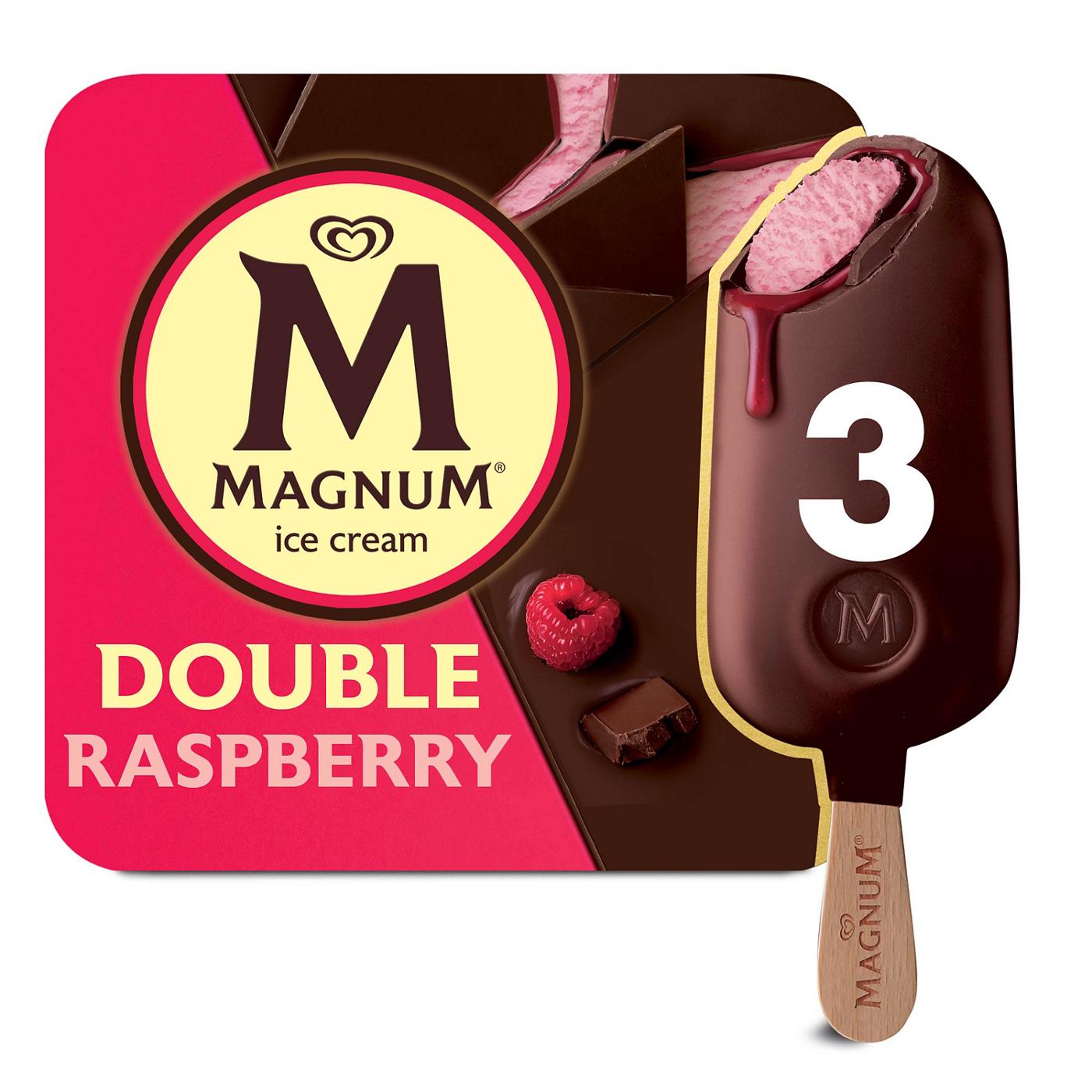 - Magnum's Double Raspberry Ice Cream Bar features raspberry ice cream double dipped in milk chocolate with a layer of luscious raspberry sauce