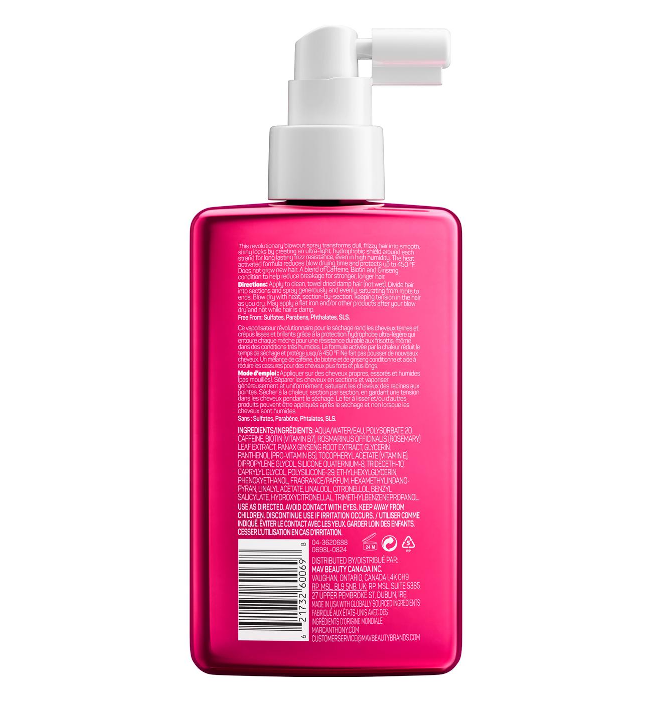 Get the ultimate blowout that defies humidity. Transform dull, frizzy locks into a smooth, glossy, featherlight finish with up to 72 hours of frizz control, even in 80% humidity*. This innovative spray creates a lightweight, hydrophobic anti-frizz shield around each strand that repels humidity and locks in sleekness. The heat activated formula helps to reduce blow drying time and protects from heat up to 450°F. Infused with a blend of Caffeine, Biotin and Ginseng condition to help reduce breakage for stronger, longer hair.