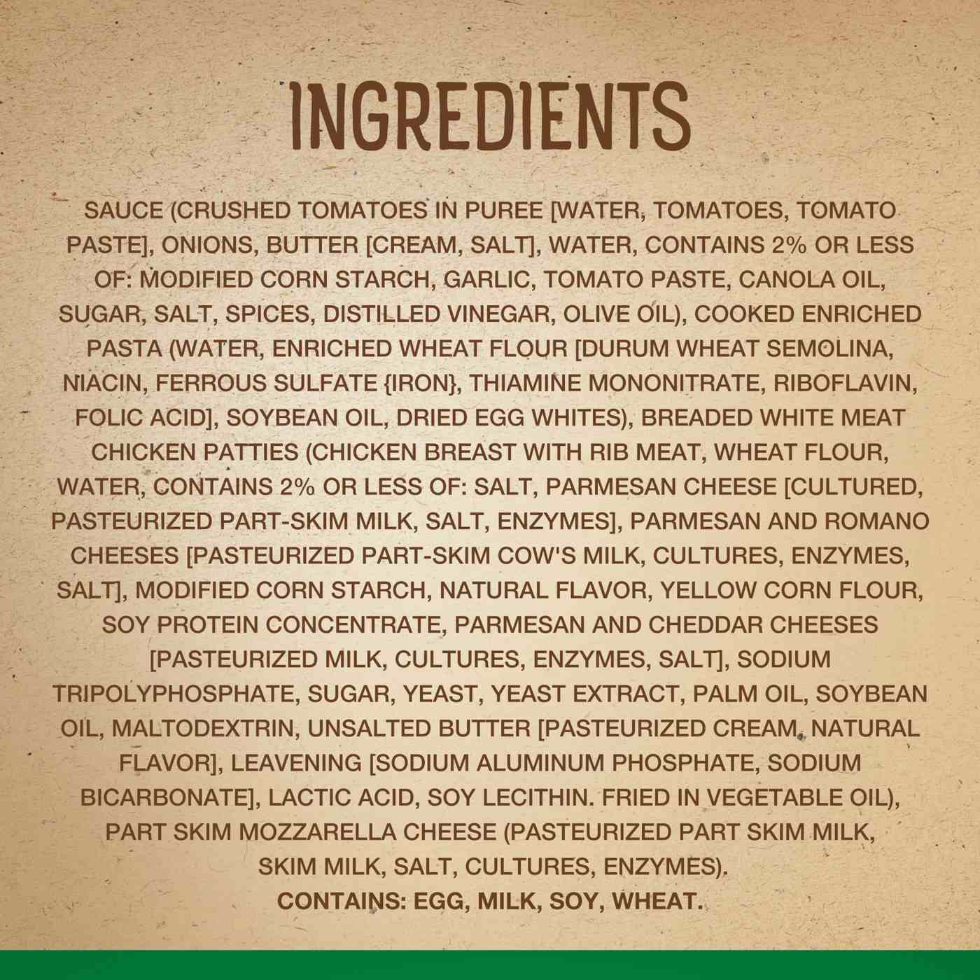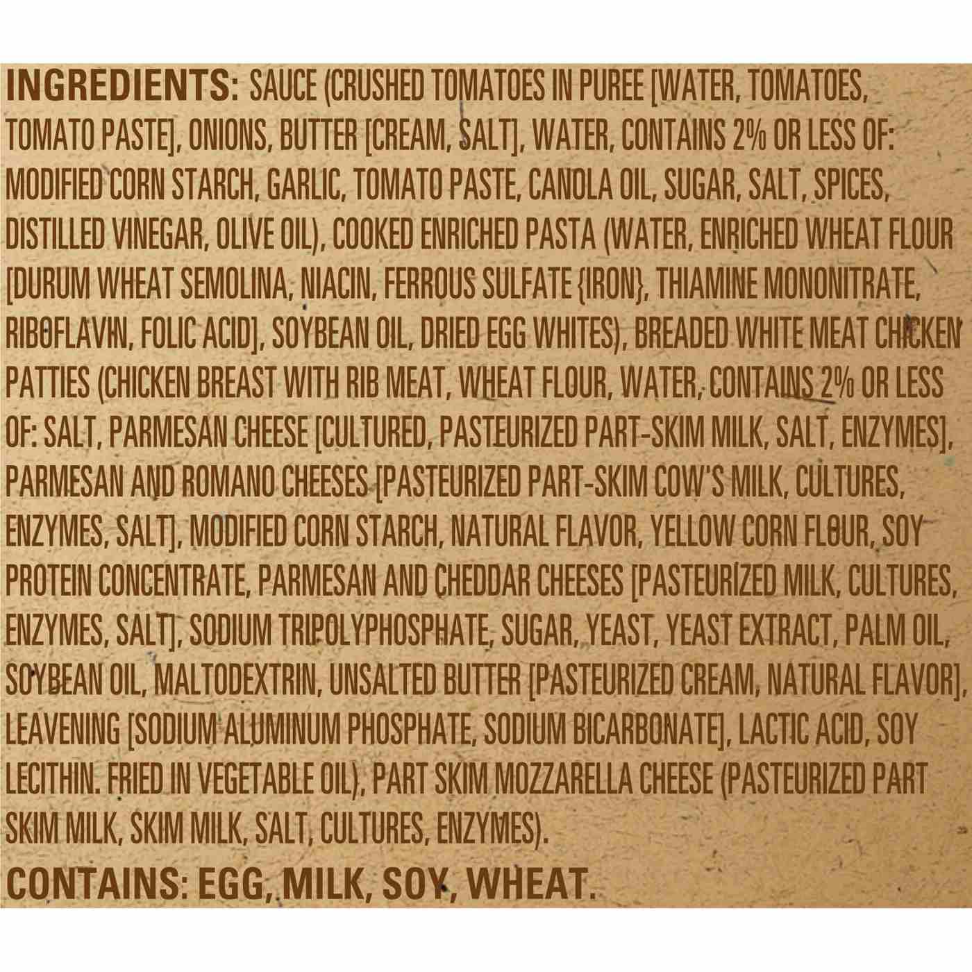 Sauce (Crushed Tomatoes in Puree [Tomatoes, Tomato Puree], Water, Tomatoes, Tomato Paste, Onions, Less than 2% of: Modified Corn Starch, Canola Oil, Garlic, Spices, Olive Oil, Sugar, Distilled Vinegar, Salt, Monosodium Glutamate), Cooked Enriched Pasta (Water, Enriched Wheat Flour [Durum Wheat Semolina, Niacin, Ferrous Sulfate {Iron}, Thiamine Mononitrate, Riboflavin, Folic Acid], Soybean Oil, Dried Egg Whites), Breaded White Meat Chicken Patties (White Meat Chicken, Wheat Flour, Water, Less than 2% of: Salt, Parmesan Cheese [Cultured, Pasteurized Part-Skim Milk; Salt, Enzymes], Parmesan and Romano Cheeses [Pasteurized Part-Skim Cow's Milk, Cultures, Enzymes, Salt], Modified Corn Starch, Natural Flavor, Yellow Corn Flour, Soy Protein Concentrate, Parmesan and Cheddar Cheeses [Pasteurized Milk, Cultures, Enzymes, Salt], Sodium Tripolyphosphate, Sugar, Yeast, Yeast Extract, Palm Oil, Maltodextrin, Unsalted Butter [Pasteurized Cream, Natural Flavor], Leavening [Sodium Aluminum Phosphate, Sodium Bicarbonate], Lactic Acid, Soy Lecithin, Fried in Vegetable Oil), Part-Skim Mozzarella Cheese (Pasteurized Part-Skim Milk, Skim Milk, Salt, Cultures, Enzymes).Allergens and safety warnings