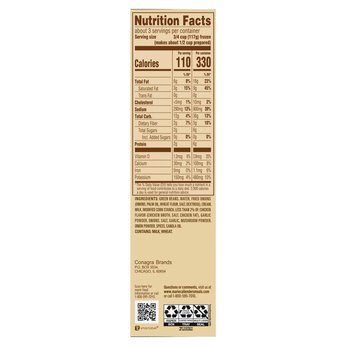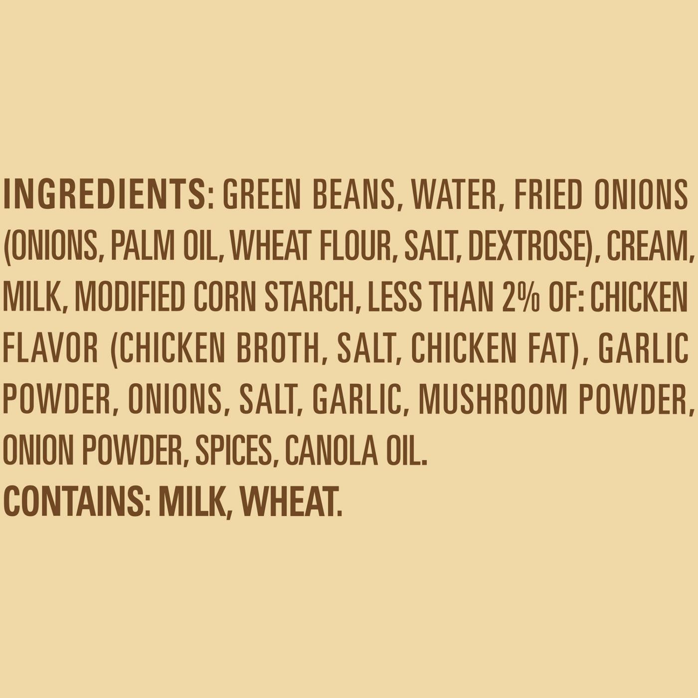 Green Beans, Water, Fried Onions (Onions, Palm Oil, Wheat Flour, Salt, Dextrose), Cream, Milk, Modified Corn Starch, Less than 2% of: Chicken Flavor (Chicken Broth, Salt, Chicken Fat), Garlic Powder, Onions, Salt, Garlic, Mushroom Powder, Onion Powder, Spices, Canola Oil.Allergens and safety warnings