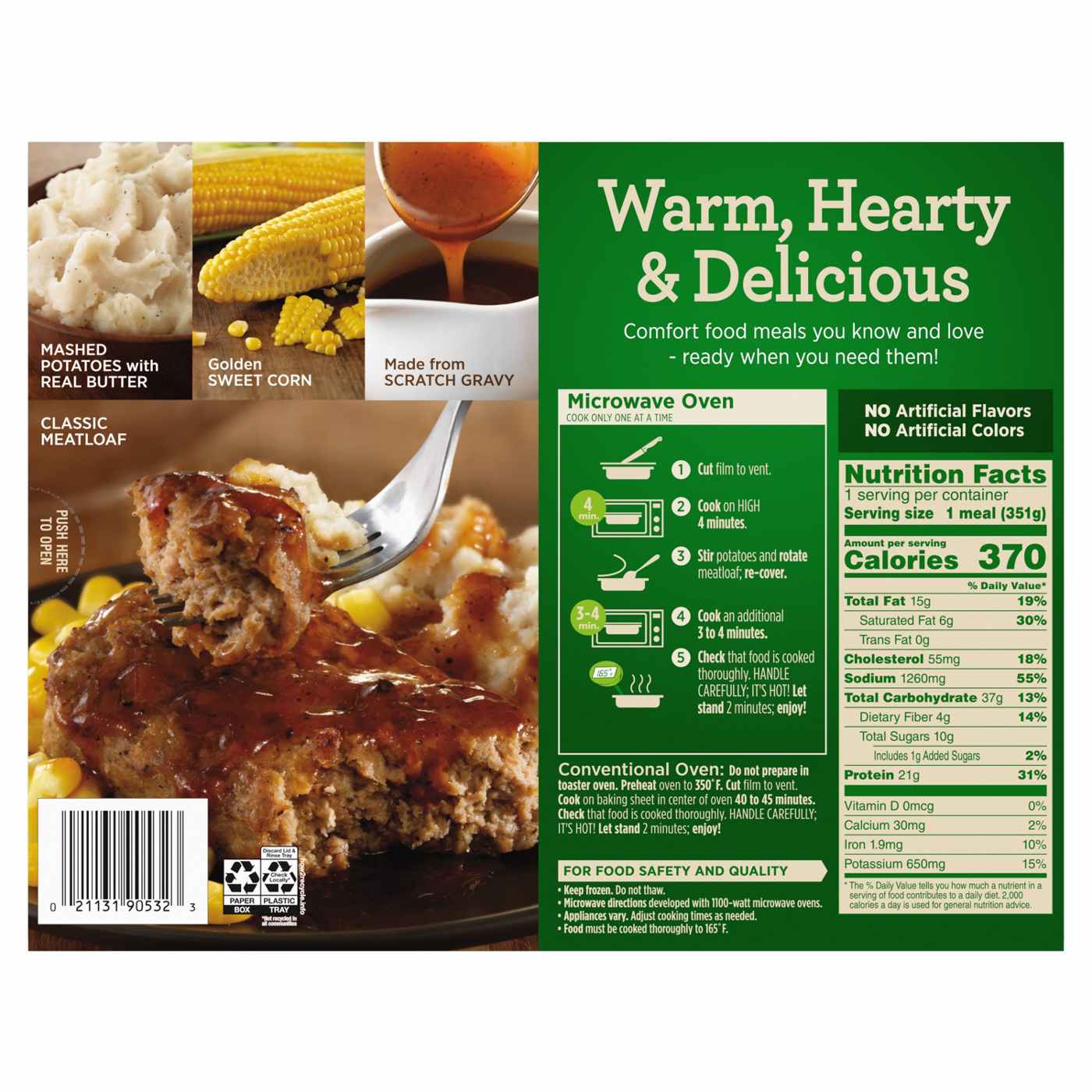 • Classic meat loaf is smothered in a made-from-scratch gravy and served with corn and mashed potatoes made with real butter to offer a frozen meal with delicious taste
