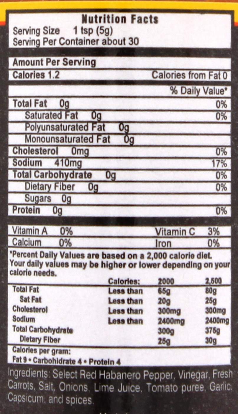 Select Red Habanero Pepper, Vinegar, Fresh Carrots, Salt, Onions, Lime Juice, Tomato Puree, Garlic, Capsicum, and Spices.Allergens and safety warnings