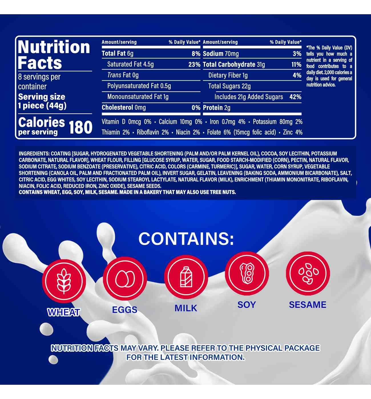 Contains Egg, Milk, Sesame, Soy, Wheat. Made In A Facility That May Also Use Tree Nuts.