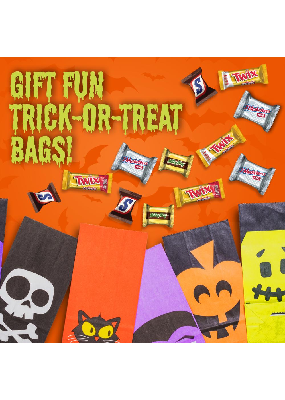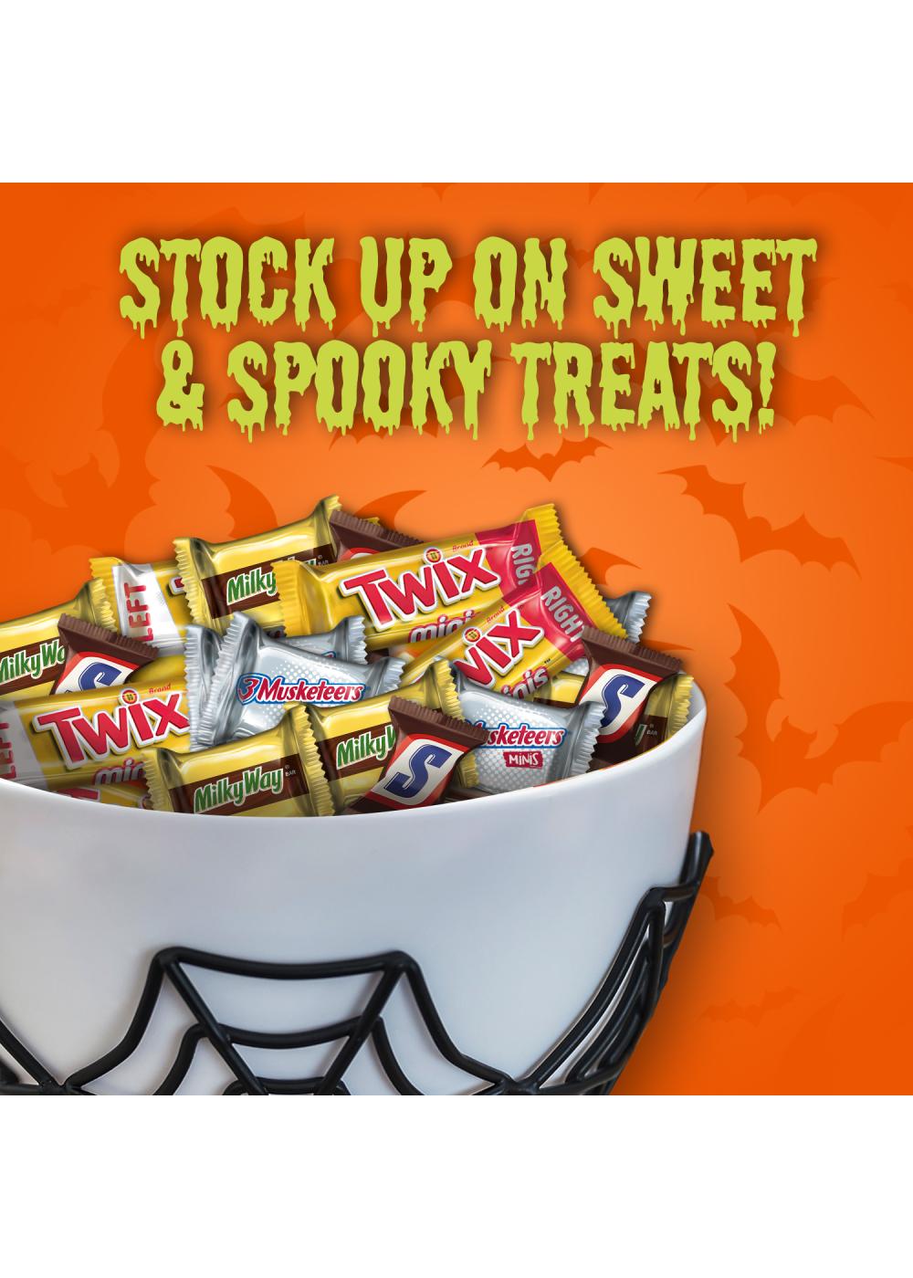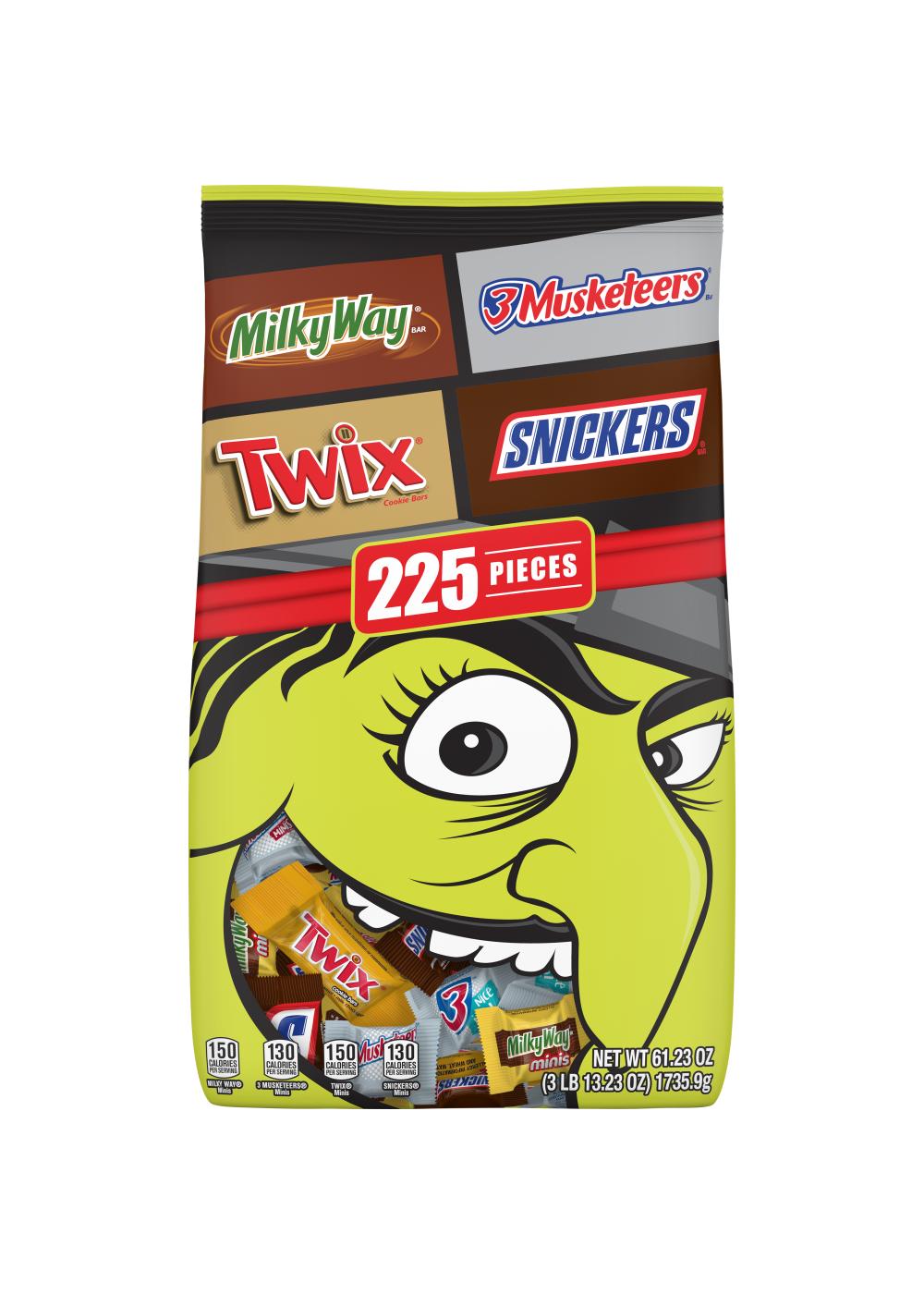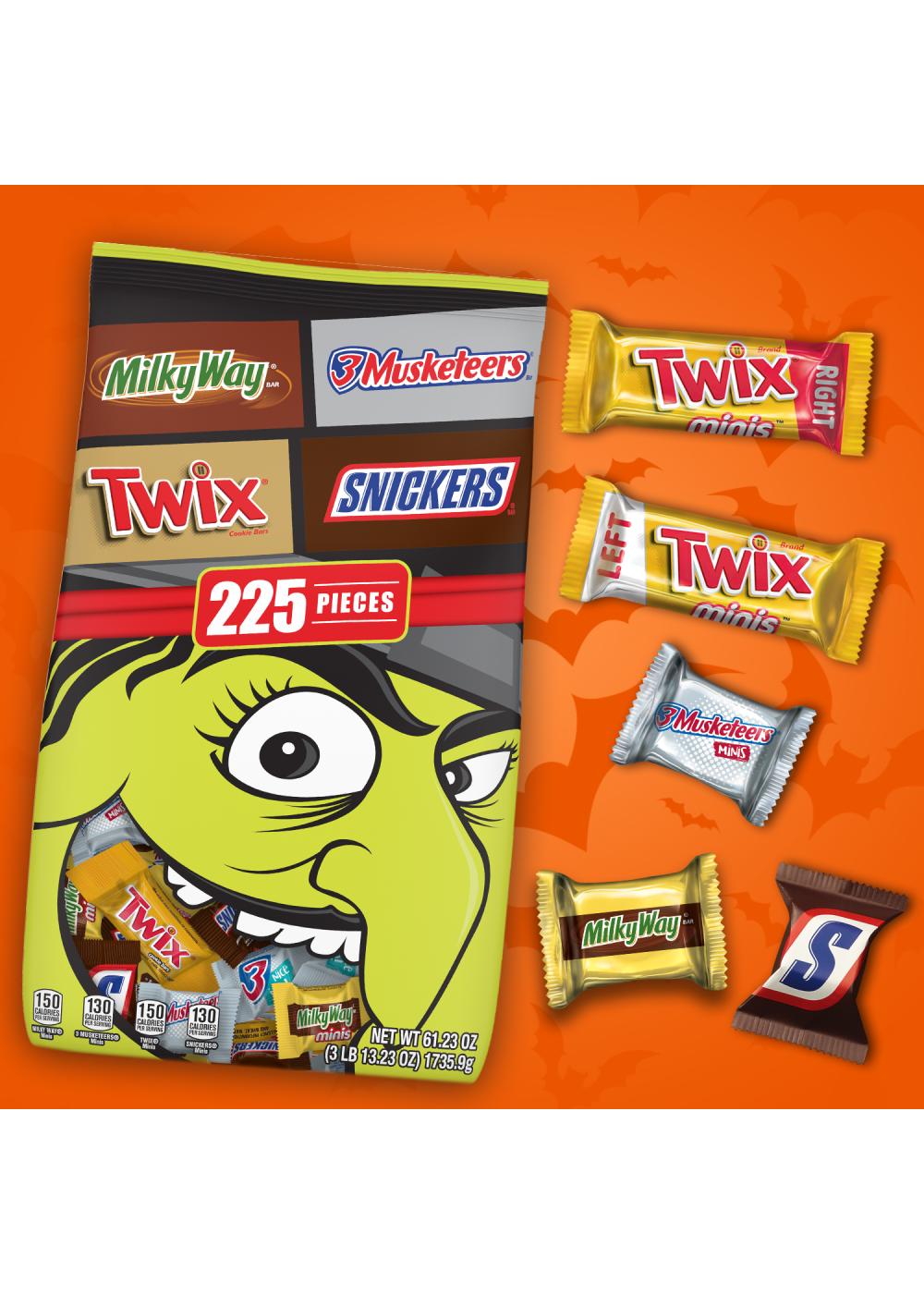 Halloween is synonymous with parties and trick or treating, and Mars Chocolate has special ways to celebrate Halloween with your favorite Chocolate Brands in spooky seasonal packaging. These mixed individually wrapped items make for festive party favors, seasonal on-the-go treats, decorative additions to any candy bowl, or a wonderful addition to any trick-or-treat bag!-Contains one (1) 61.23-ounce, 225-piece stand-up bag with an assortment of MARS Chocolate Miniature Chocolate Bars-This variety mix includes SNICKERS, TWIX, 3 MUSKETEERS, and MILKY WAY Chocolate Candy-Enjoy our favorite MARS Chocolate Candies in delicious bite-size pieces at holiday parties, the office, for Halloween, or birthday parties-Fill your candy dish with flavorful fun with your favorite MARS Candy brands in bright, metallic-piece wraps-MARS Chocolate Candy is the perfect chocolate treat for big celebrations or office parties