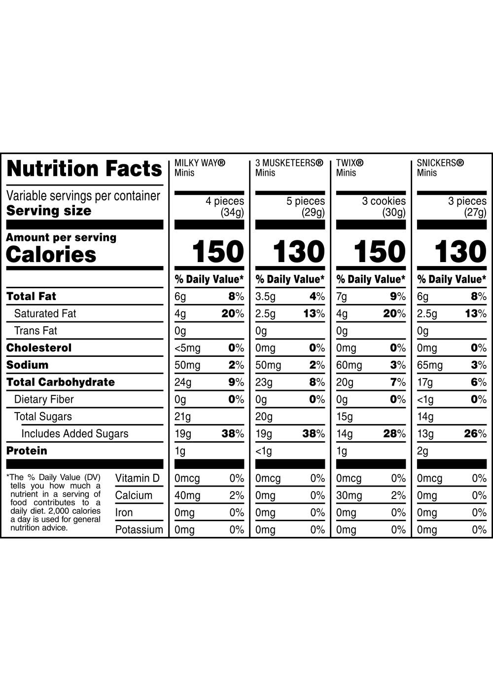 Milky Way Minis: Milk Chocolate (Sugar, Cocoa Butter, Skim Milk, Chocolate, Lactose, Milkfat, Soy Lecithin, Artificial Flavor), Corn Syrup Sugar, Vegetable Oil (Hydrogenated Palm Kernel Oil and/or Palm Oil), Skim Milk, Less than 2% - Milkfat, Cocoa Powder Processed with Alkali, Barley Malt Extract, Lactose, Salt, Egg Whites, Chocolate, Artificial Flavor. 3 Musketeers Minis: Milk Chocolate (Sugar, Chocolate, Cocoa Butter, Skim Milk, Lactose, Milkfat, Soy Lecithin), Sugar, Corn Syrup, Vegetable Oil (Hydrogenated Palm Kernel Oil and/or Palm Oil), Cocoa Powder Processed with Alkali, Less than 1.5% - Salt, Egg Whites, Artificial and Natural Flavors. Twix Minis: Milk Chocolate (Sugar, Cocoa Butter, Chocolate, Skim Milk, Lactose, Milkfat, Soy Lecithin, PGPR, Artificial Flavors), Enriched Wheat Flour (Wheat Flour, Niacin, Reduced Iron, Thiamine Mononitrate, Riboflavin, Folic Acid), Sugar, Palm Oil, Corn Syrup, Skim Milk, Dextrose, Less than 2% - Salt, Cocoa Powder, Soy Lecithin, Modified Corn Starch, Baking Soda, Artificial Flavor. Snickers Minis: Milk Chocolate (Sugar, Cocoa Butter Chocolate, Skim Milk, Lactose, Milkfat, Soy Lecithin), Peanuts, Corn Syrup, Sugar, Palm Oil, Skim Milk, Lactose, Salt, Egg Whites, Artificial Flavor.Allergens and safety warnings