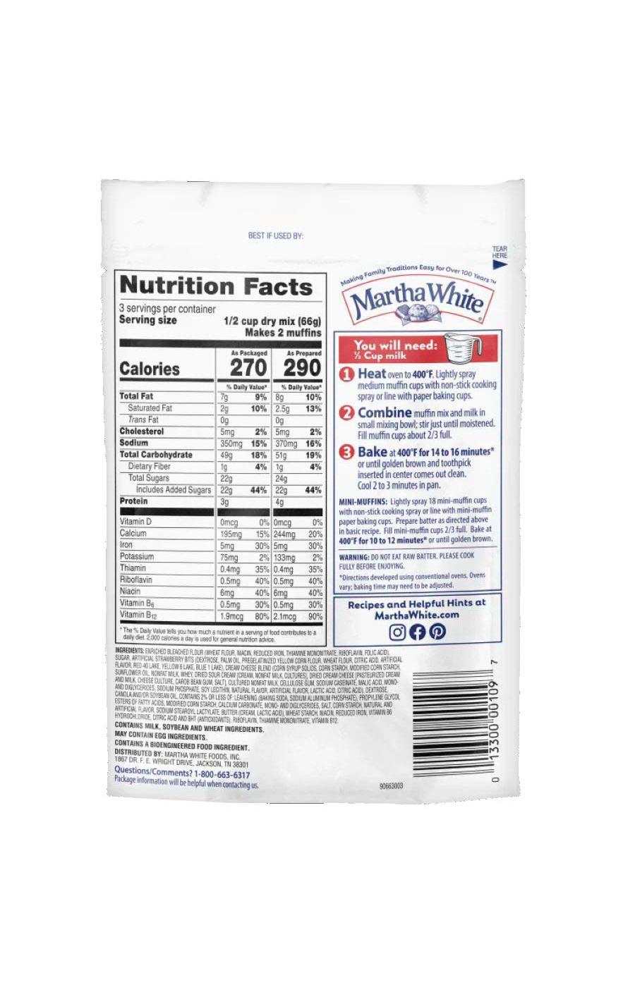 Enriched Bleached Flour (Wheat Flour, Niacin, Reduced Iron, Thiamine Mononitrate, Riboflavin, Folic Acid), Sugar, Artificial Strawberry Bits (Dextrose, Palm Oil, Pregelatinized Yellow Corn Flour, Wheat Flour, Citric Acid, Artificial Flavor, Red 40 Lake, Yellow 6 Lake, Blue 1 Lake), Cream Cheese Blend (Corn Syrup Solids, Corn Starch, Modified Corn Starch, Sunflower Oil, Nonfat Milk, Whey, Dried Sour Cream [Cream, Nonfat Milk, Cultures], Dried Cream Cheese [Pasteurized Cream and Milk, Cheese Culture, Carob Bean Gum, Salt], Cultured Nonfat Milk, Cellulose Gum, Sodium Caseinate, Malic Acid, Mono- and Diglycerides, Sodium Phosphate, Soy Lecithin, Natural Flavor, Artificial Flavor, Lactic Acid, Citric Acid), Dextrose, Canola and/or Soybean Oil, Contains 2% or Less of: Leavening (Baking Soda, Sodium Aluminum Phosphate), Propylene Glycol Esters of Fatty Acids, Modified Corn Starch, Calcium Carbonate, Mono- and Diglycerides, Salt, Corn Starch, Natural and Artificial Flavor, Sodium Stearoyl Lactylate, Butter (Cream, Lactic Acid), Wheat Starch, Niacin, Reduced Iron, Vitamin B6 Hydrochloride, Citric Acid and BHT (Antioxidants), Riboflavin, Thiamine Mononitrate, Vitamin B12.Allergens and safety warnings
