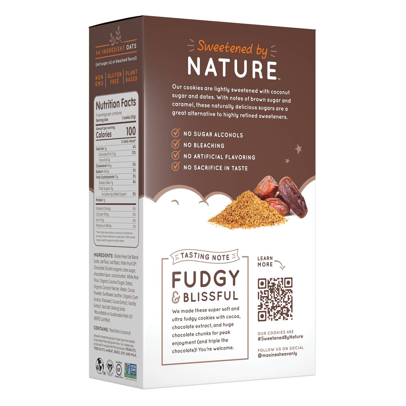 Gluten Free Oat Blend (Oats, Oat Flour, Oat Fiber), Palm Fruit Oil (Roundtable on Sustainable Palm Oil (RSPO) Certified), Chocolate Chunks (Organic Cane Sugar, Chocolate Liquor, Cocoa Butter), White Rice Flour, Organic Coconut Sugar, Dates, Organic Coconut Nectar, Water, Cocoa Powder, Sunflower Lecithin, Organic Gum Acacia, Flaxseed, Cocoa Extract, Vanilla Extract, Sea Salt, Baking Soda.Allergens and safety warnings