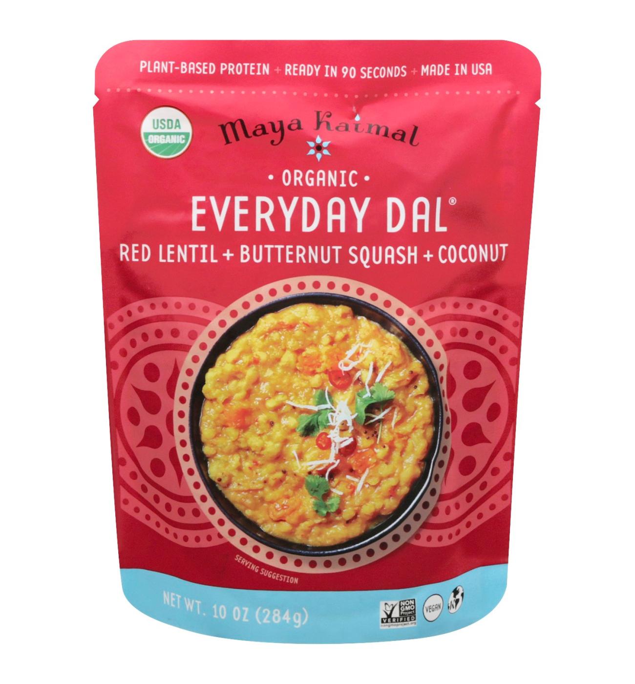 Maya Kaimal Organic Everyday Dal is made with red lentils, butternut squash, coconut, red chili and brown mustard seeds for a thicker texture and a hint of sweetness. A twist on the traditional Indian bean dish, this dal makes a tasty lunch on its own or a side dish with dinner. Try mixing in some fried shallots, coconut and herbs if you like.