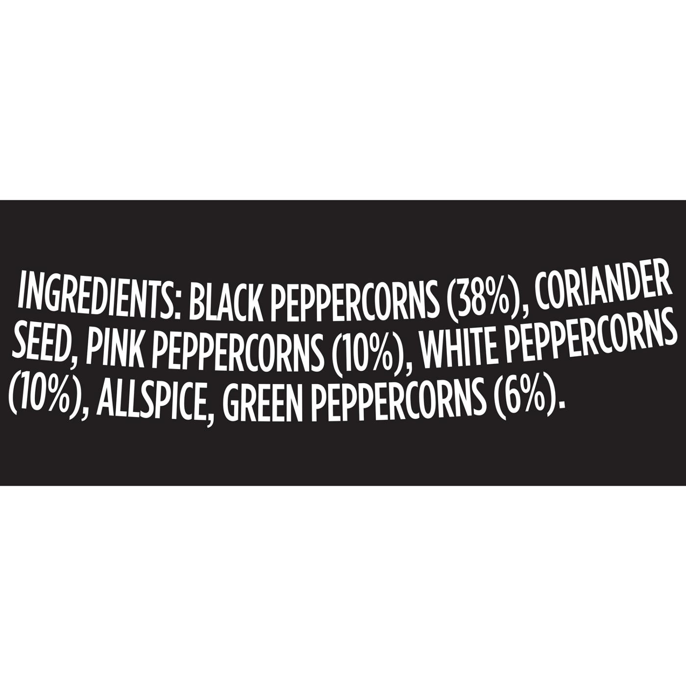 McCormick Non GMO Peppercorn Medley Adjustable Grinder, McCormick Peppercorn Medley Grinder is a colorful blend of black, white, green, and pink peppercorns, with whole allspice and coriander. The built-in adjustable grinder offers a coarser grind for seasoning meats or a finer grind for dishes like stews, vegetables, or eggs. Our whole peppercorn and spice medley brings unique flavor and color to your favorite dishes. It adds contrasting sharp and mild heat from the peppercorns and complex spice notes from allspice and coriander. A simple turn of the red tab adjusts the grinder from coarse ground to finely ground pepper. Then turn upside down and twist over everything from grilled meats to pastas and salads. Keep in the kitchen, at the table, or by the grill for freshly ground flavor anytime.- A medley of black peppercorns, coriander, pink peppercorns, white peppercorns, allspice and green peppercorns- Adjustable grinder conveniently offers coarse, medium or fine grind; not refillable- McCormick Seasoning Grinder glass bottles are recyclable; remove grinder head first- To use: remove cap, adjust grinder to desired grind, turn upside down and twist- Use coarse pepper for bold texture and flavor in meat rubs- Use the finer grind to sprinkle over stews, vegetables, potatoes, eggs or salads- Keep McCormick salt and pepper grinders at the table to freshly season your foods- McCormick Non GMO Peppercorn Medley Adjustable Grinder, 0.85 oz