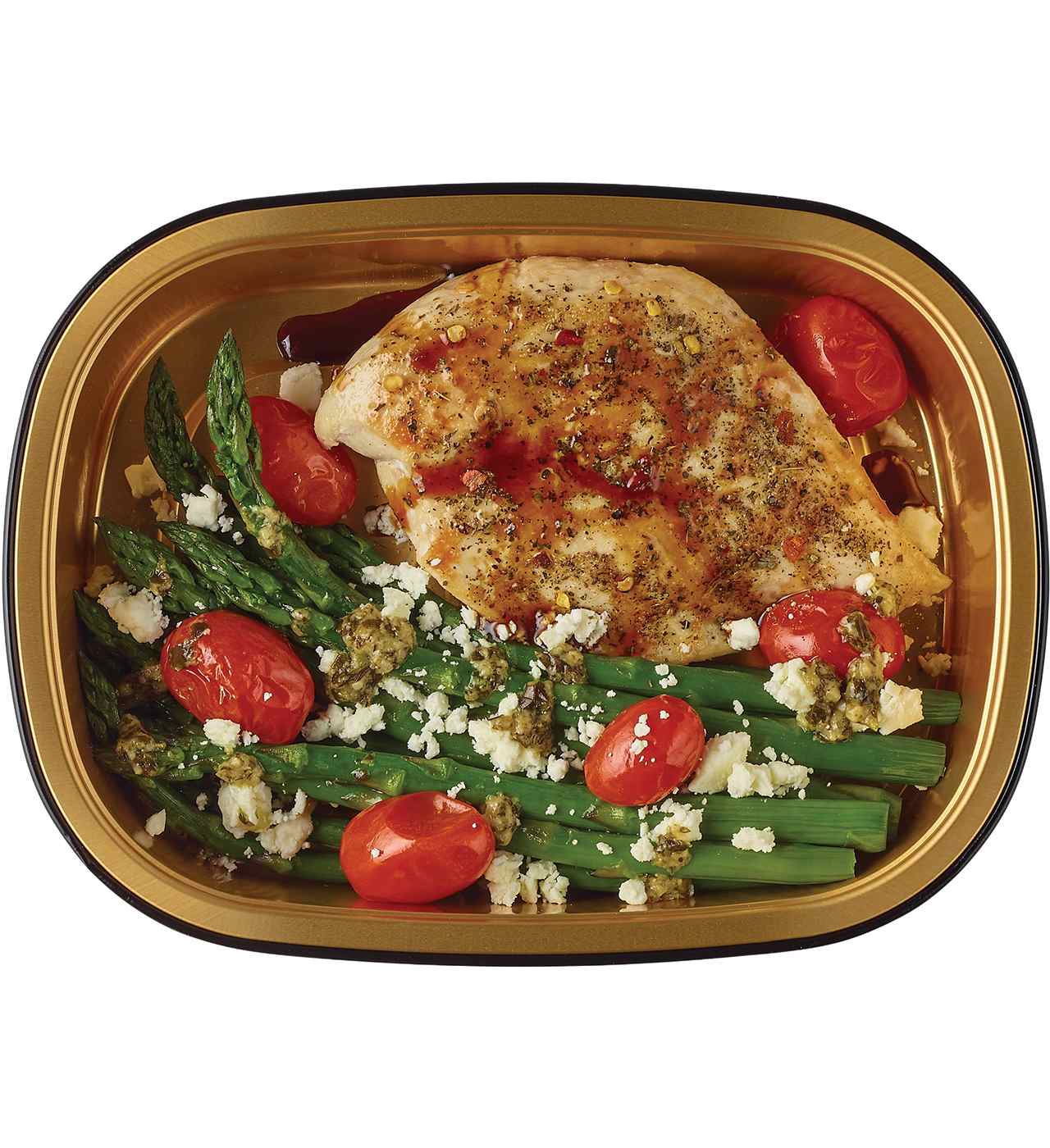 Seasoned Chicken Breast With Balsamic Glaze (Boneless, Skinless Chicken Breast, Balsamic Glaze [Balsamic Vinegar Of Modena 60% {Wine Vinegar, Cooked And Concentrated Grape Must}, Cooked Grape Must, Modified Corn Starch], Seasoning [Salt, Spices, Garlic, Onion]), Basil Pesto Asparagus With Feta Cheese (Asparagus, Feta Cheese [Pasteurized Milk, Salt, Cheese Culture, Enzymes, Potato Starch {Anticaking}], Basil Pesto Butter [Butter {Cream, Salt}, Water, Basil, Parmesan Cheese {Pasteurized Part-Skim Milk, Cheese Culture, Salt, Enzymes}, Extra Virgin Olive Oil, Lemon Juice, Apple Cider Vinegar, Garlic, Salt, Parsley, Black Pepper, Xanthan Gum, Corn Starch]), Tomatoes.Allergens and safety warnings