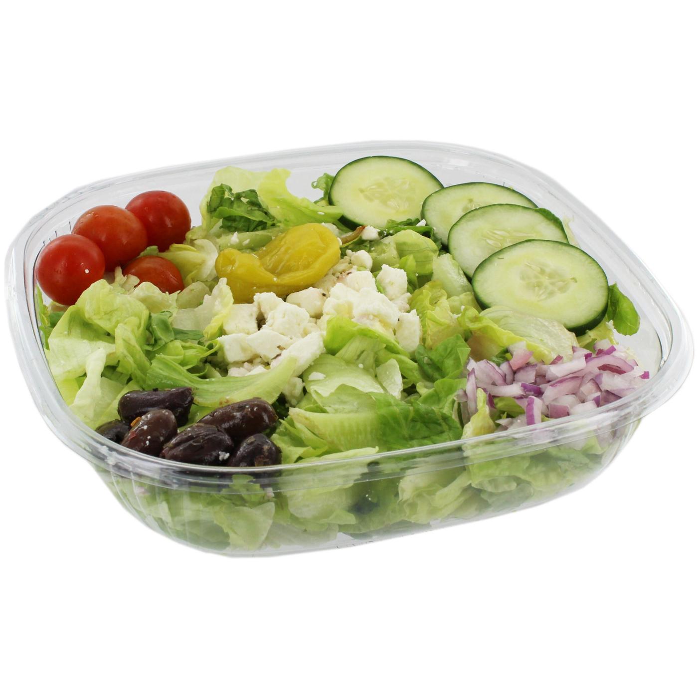This crisp, colorful salad includes chopped romaine topped with diced red onion, champagne sweet tomatoes, sliced cucumbers, feta crumbles, Greek peppers and Kalamata Olives. This fresh salad is ready to enjoy with your favorite dressing!